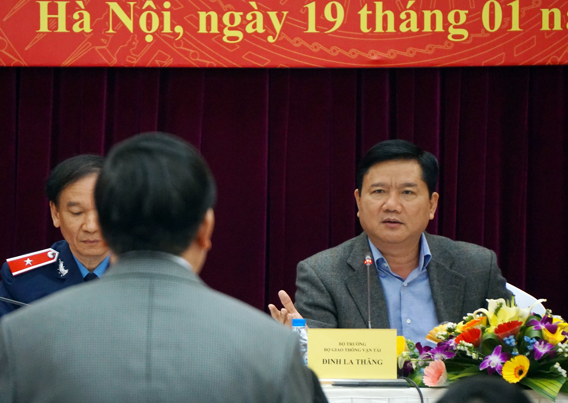| Bộ trưởng Giao thông vận tải Đinh La Thăng chất vấn Tổng cục trưởng Tổng cục Đường bộ Nguyễn Văn Huyện về việc dỡ bỏ các biển báo bất hợp lý sáng 19/1. Ảnh: Công Khanh. |