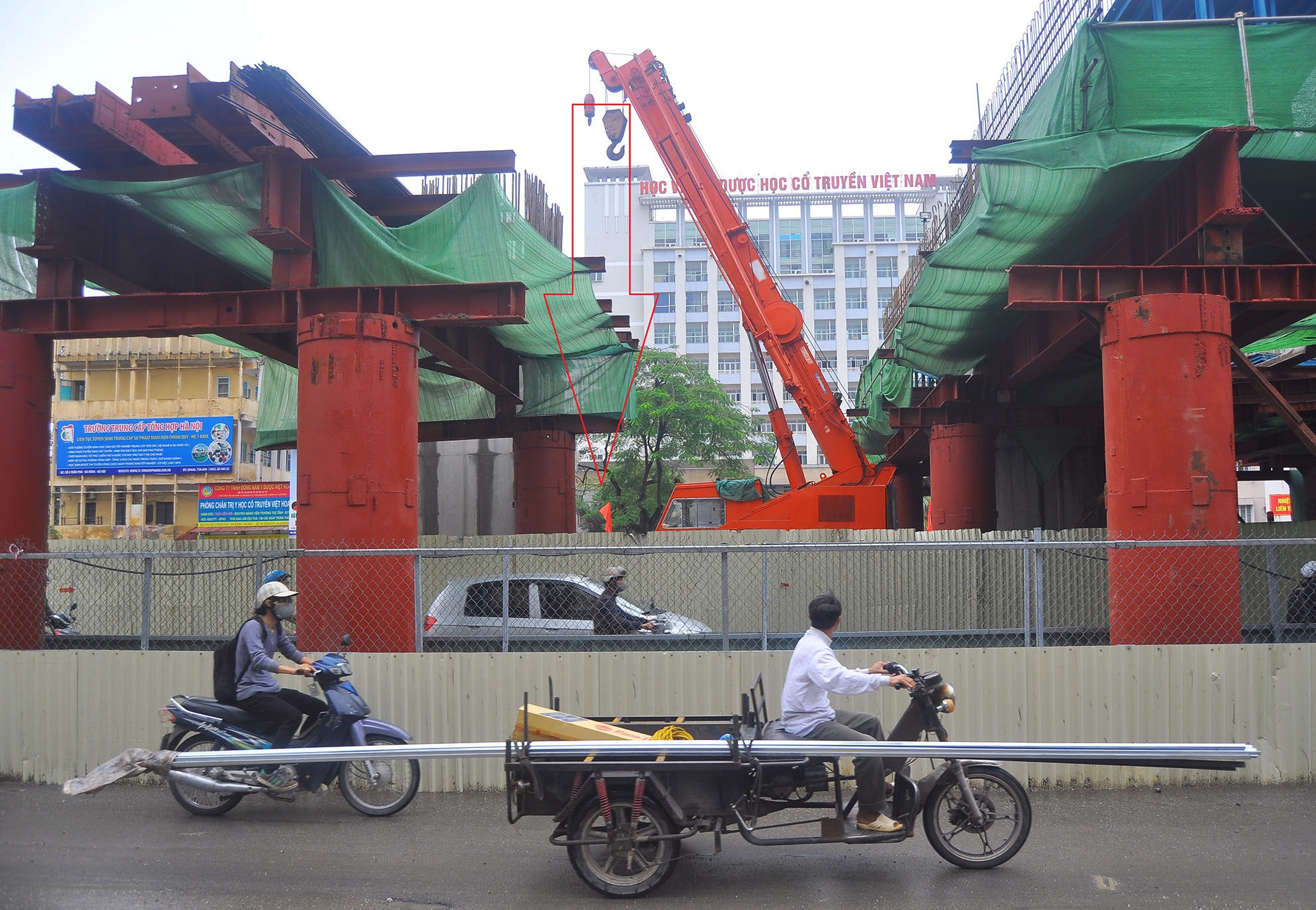 | Chiếc cẩu nâng lồng sắt thi công tại nhà ga Thanh Xuân III nâng cao quá mức dẫn đến va chạm làm 3 trong 8 thanh thép vỡ mối hàn văng xuống trúng người. Ảnh: Hoàn Nguyễn. |