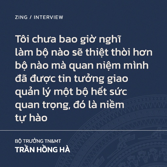 - Có thể nói thẳng là tôi chưa bao giờ nghĩ làm bộ nào sẽ thiệt thòi hơn bộ nào. Với tôi, TN&MT là bộ rất quan trọng. Là tư lệnh ngành, tôi có trách nhiệm lớn và cũng rất tự hào khi được giao trọng trách ấy, để mình có cơ hội được thử thách, để được đóng góp cho nhân dân, cho đất nước.