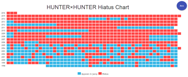 | Số tuần tạm dừng của Hunter X Hunter kể từ khi ra mắt cho tới nay (số tuần gián đoạn đánh dấu ô màu đỏ). |