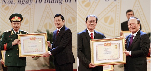 | Vũ Tự Lẫm (bên phải) nhận danh hiệu Nghệ sĩ Ưu tú, con trai là danh hài Tự Long trở thành Nghệ sĩ Nhân dân. Ảnh: VTC |