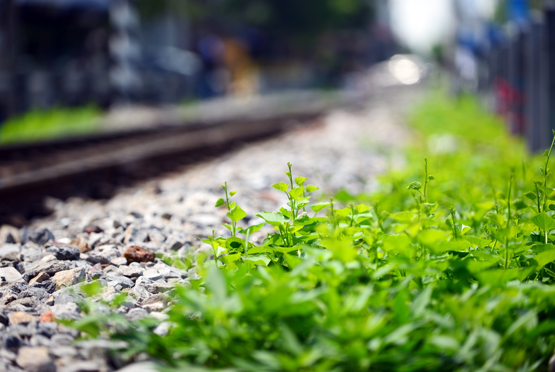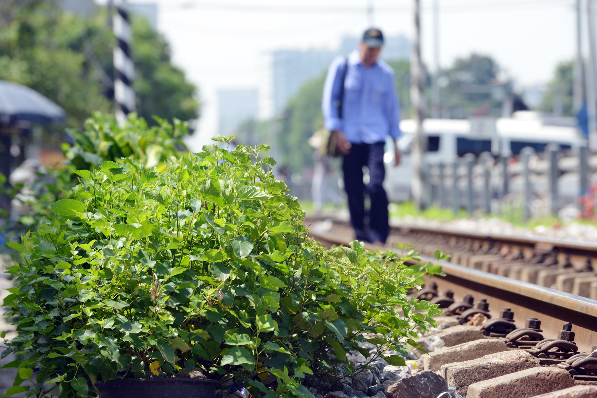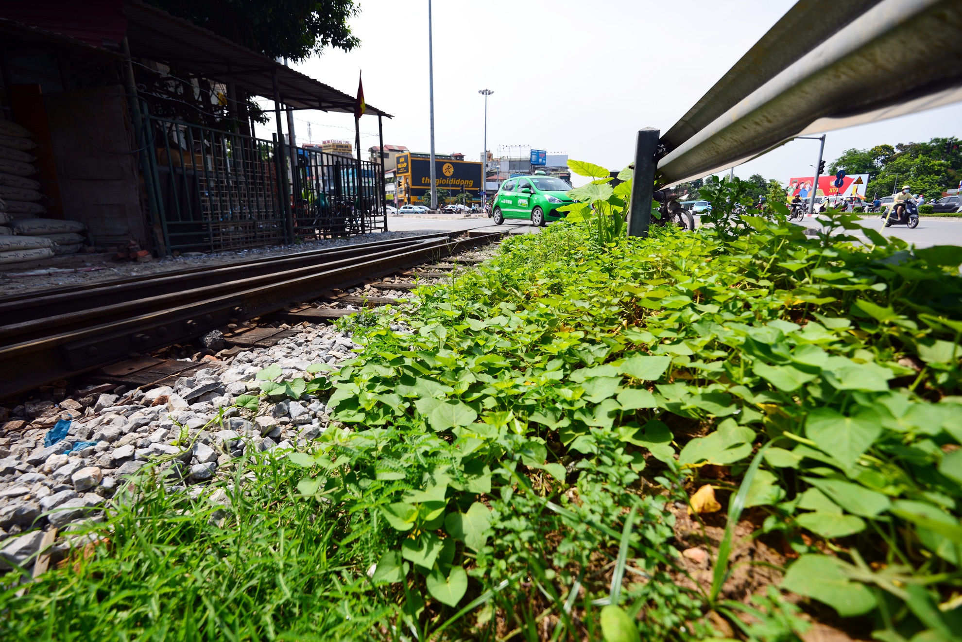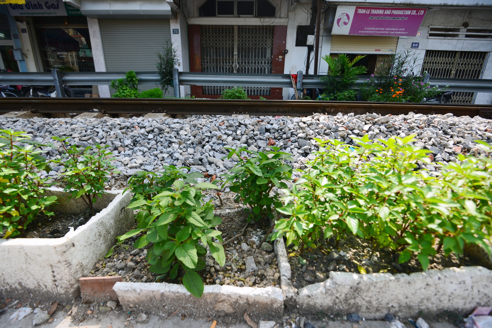 Những vườn rau sạch của người dân thủ đô không chỉ mọc lên ven sông, kênh, mà còn ở bất cứ chỗ nào có đất. Tại ven đường ray xe lửa đoạn qua Giải Phóng (quận Đống Đa), đối lập với hình ảnh sỏi đá khô cằn là màu xanh mát của những luống rau xanh.