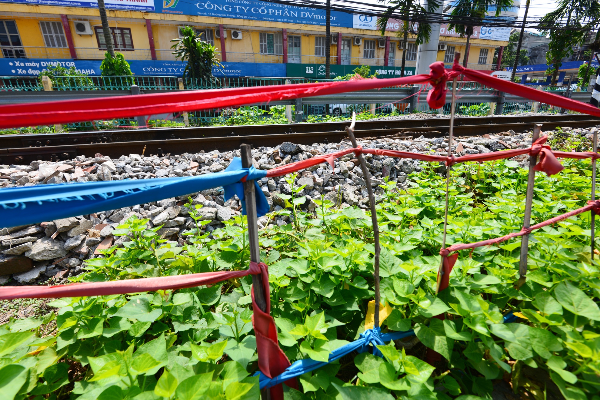 Cải tạo đất để trồng rau sạch, những người dân sống ven đường tàu còn "phân lô", căng khung để tiện chăm sóc "vườn" nhà mình.