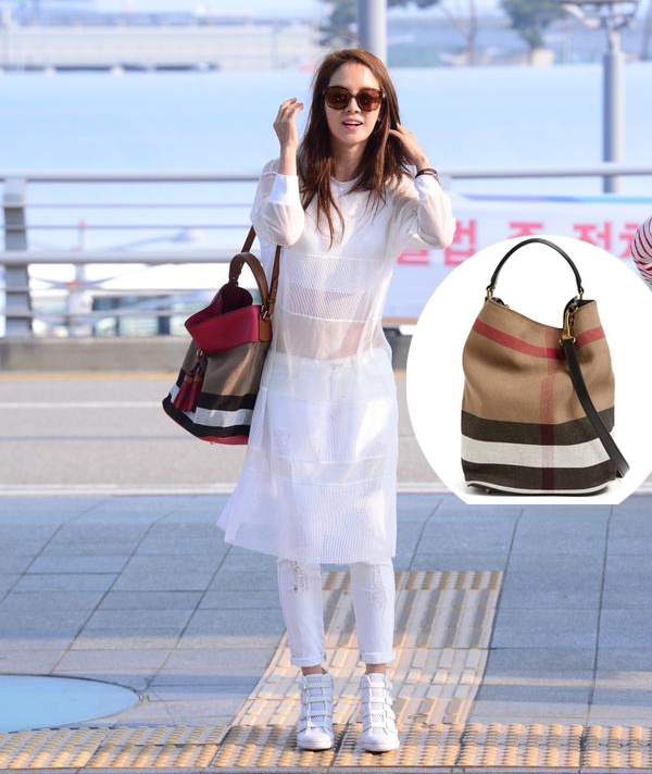| Khi ra sân bay chuẩn bị đi Hong Kong để tham dự sự kiện fan meeting của Running Man, Song Ji Hyo sử dụng chiếc túi bucket của Burberry. Thiết kế cổ điển này của thương hiệu nổi tiếng thế giới có giá 1.595 USD. |