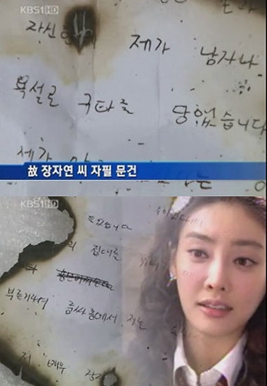 | Jang Ja Yeon cùng những dòng thư tố cáo bị cưỡng ép và xâm hại trong thời gian dài. |