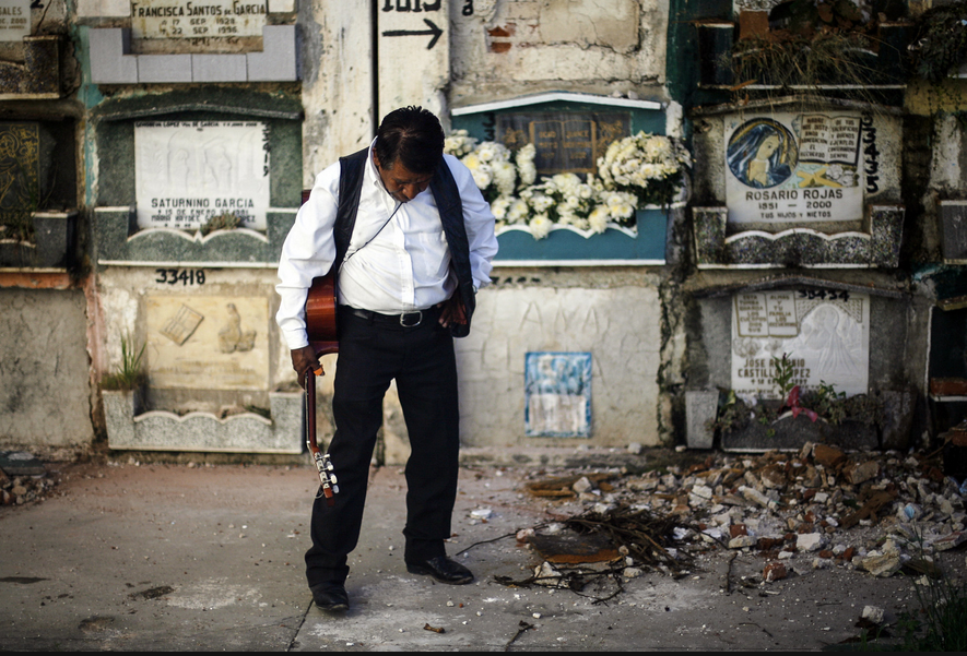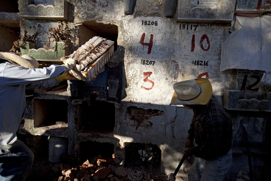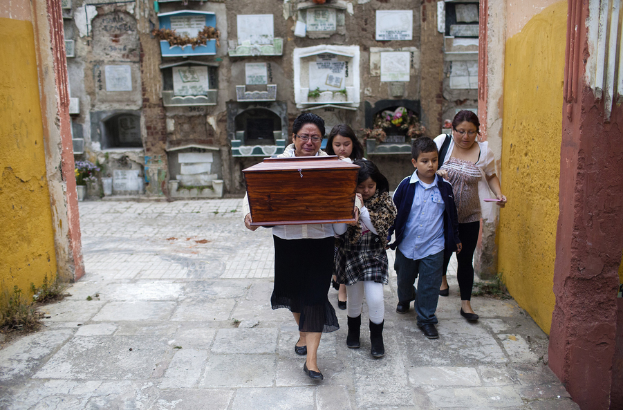 Bà Maria Gomez ôm hộp chứa thi hài của con trai 6 tháng tuổi sau khi các phu mộ khai quật hài cốt từ nơi chôn cất. Thi hài của cậu bé, qua đời vào năm 1983, sẽ được chuyến tới một nghĩa trang gần nhà bà Maria ở ngoại ô thủ đô Guatemala. Theo quy định của nghĩa trang công cộng lớn nhất quốc gia Trung Mỹ, 6 năm sau khi chôn cất, gia đình phải trả khoảng 24 USD để người ta dọn dẹp mộ cho 4 năm tiếp theo. Nếu họ không trả đủ tiền, công nhân nghĩa trang buộc khai quật và đưa xương cốt tới một ngôi mộ tập thể.