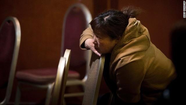 | Thân nhân một hành khách trên chuyến bay MH370 ngồi chờ tin tại khách sạn ở Bắc Kinh. Ảnh: AP. |