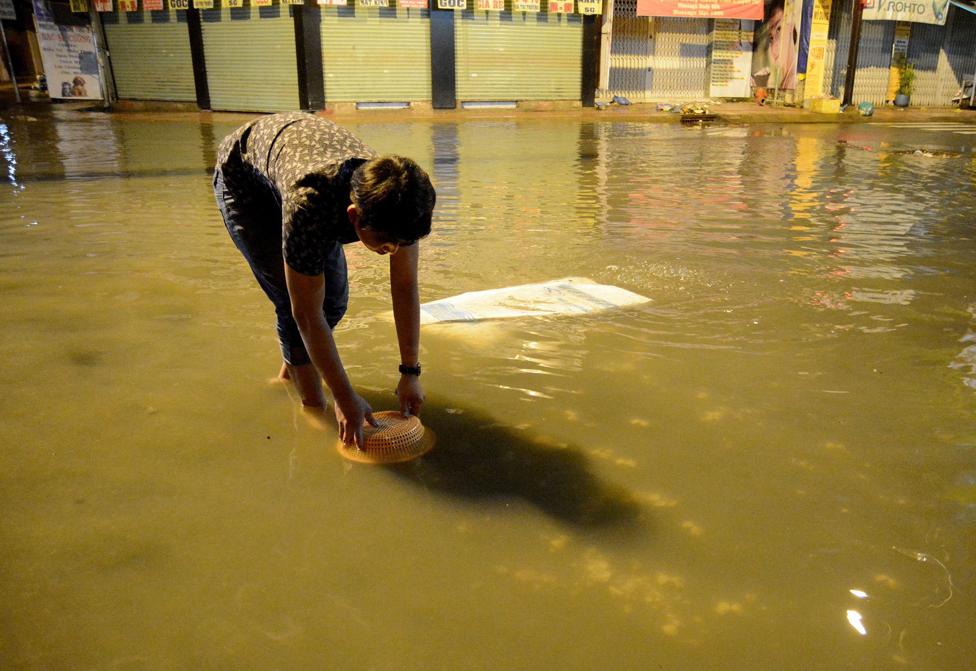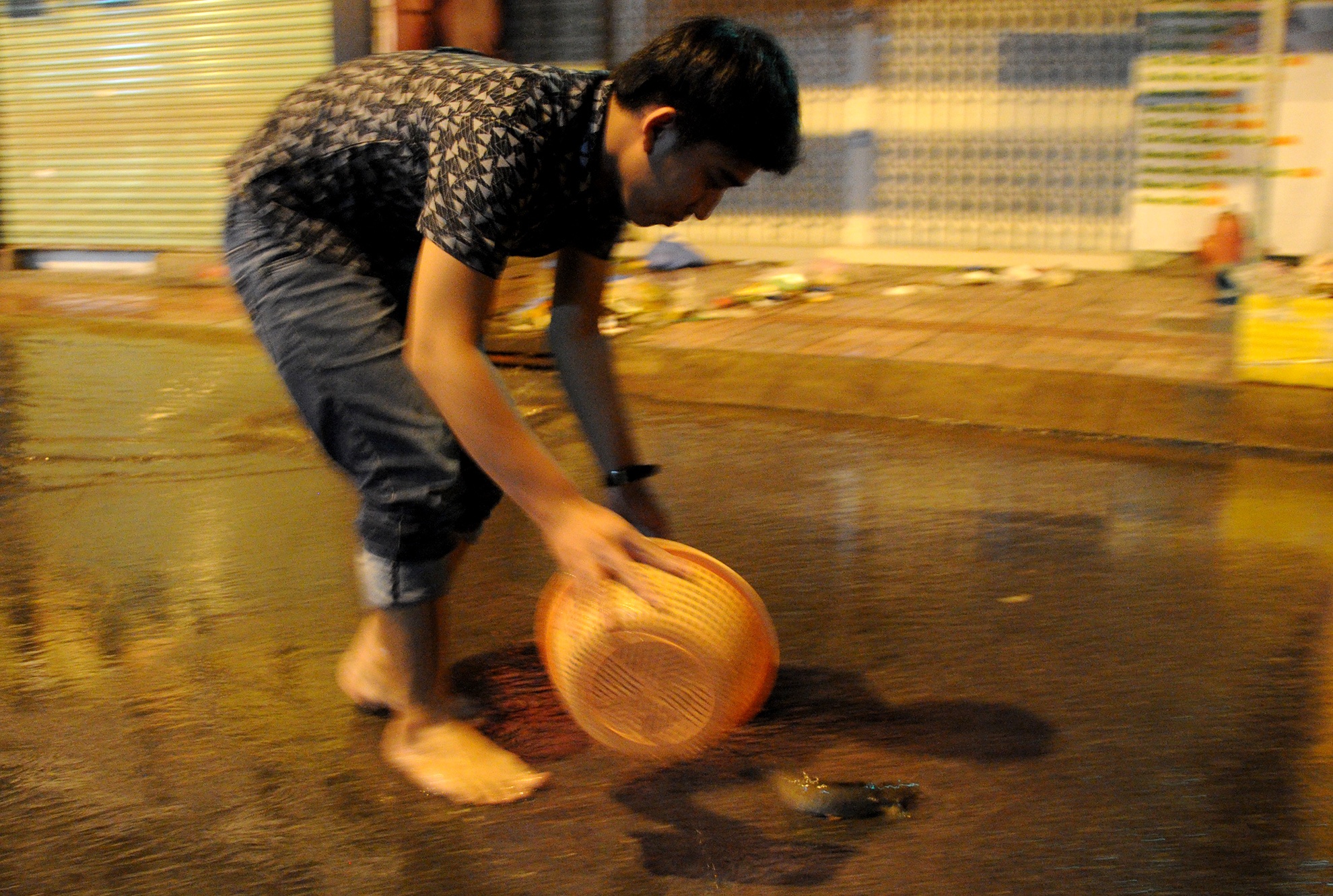 | Còn tại khu vực ngã tư đường Tân Hoà Đông-Phan Anh (quận 6), anh Châu phát hiện thấy có cá bơi trên đường đã mang chiếc rổ nhựa ra bắt. |