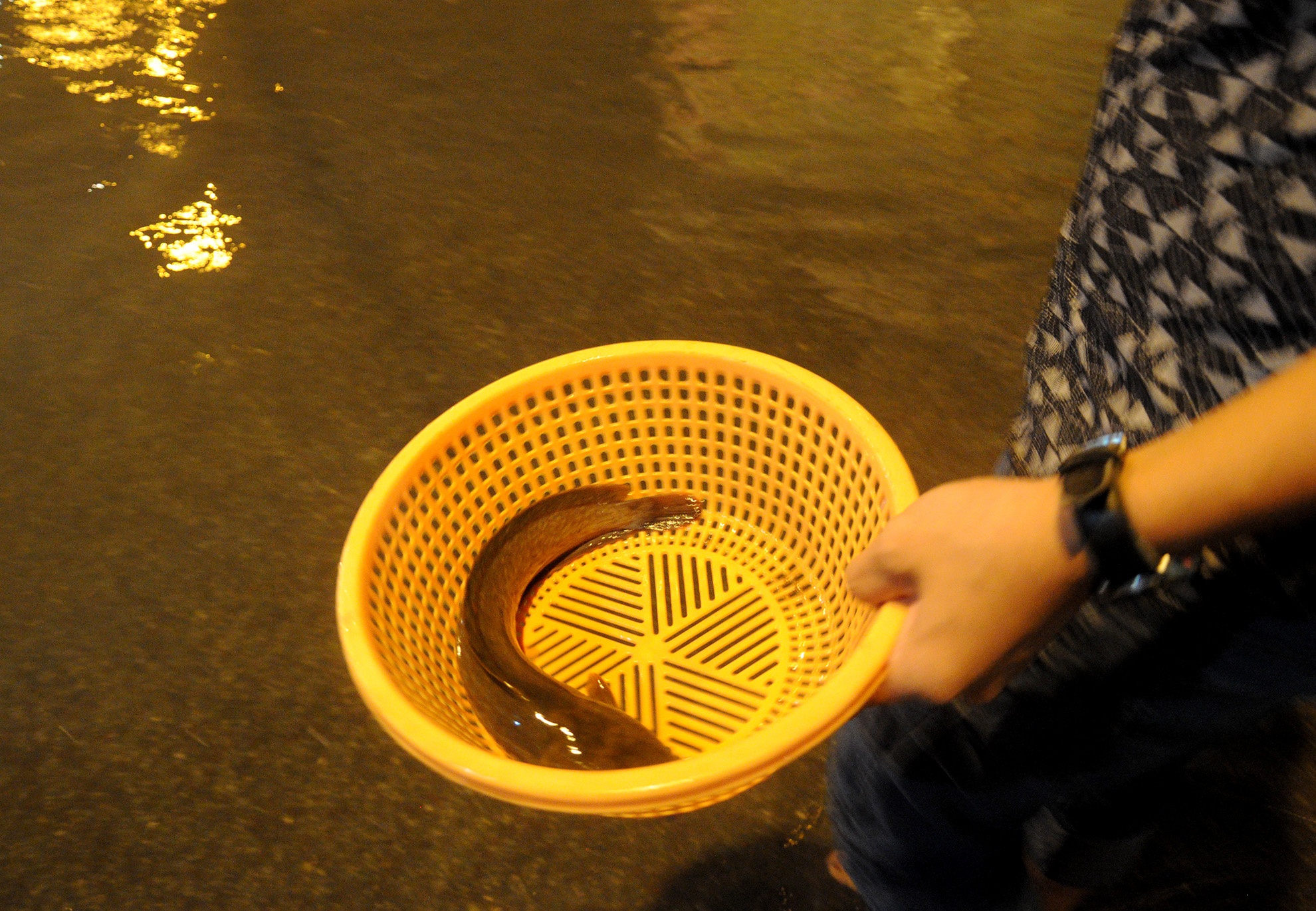 | Nước ngập khoảng 20 cm, ánh đèn đường sáng rực nên mỗi khi có cá lớn bơi lượn chậm, rất dễ nhìn thấy để úp rổ. |