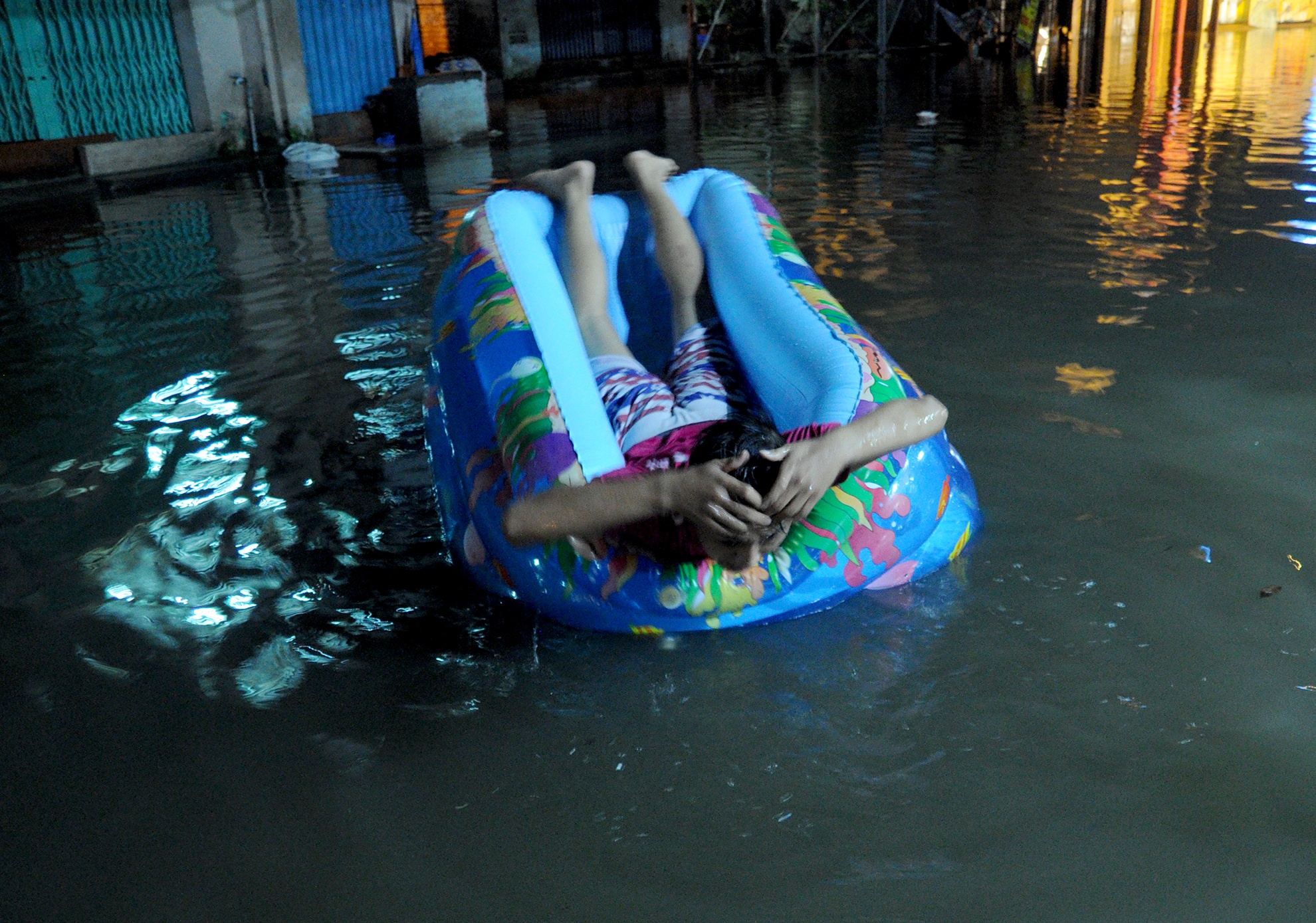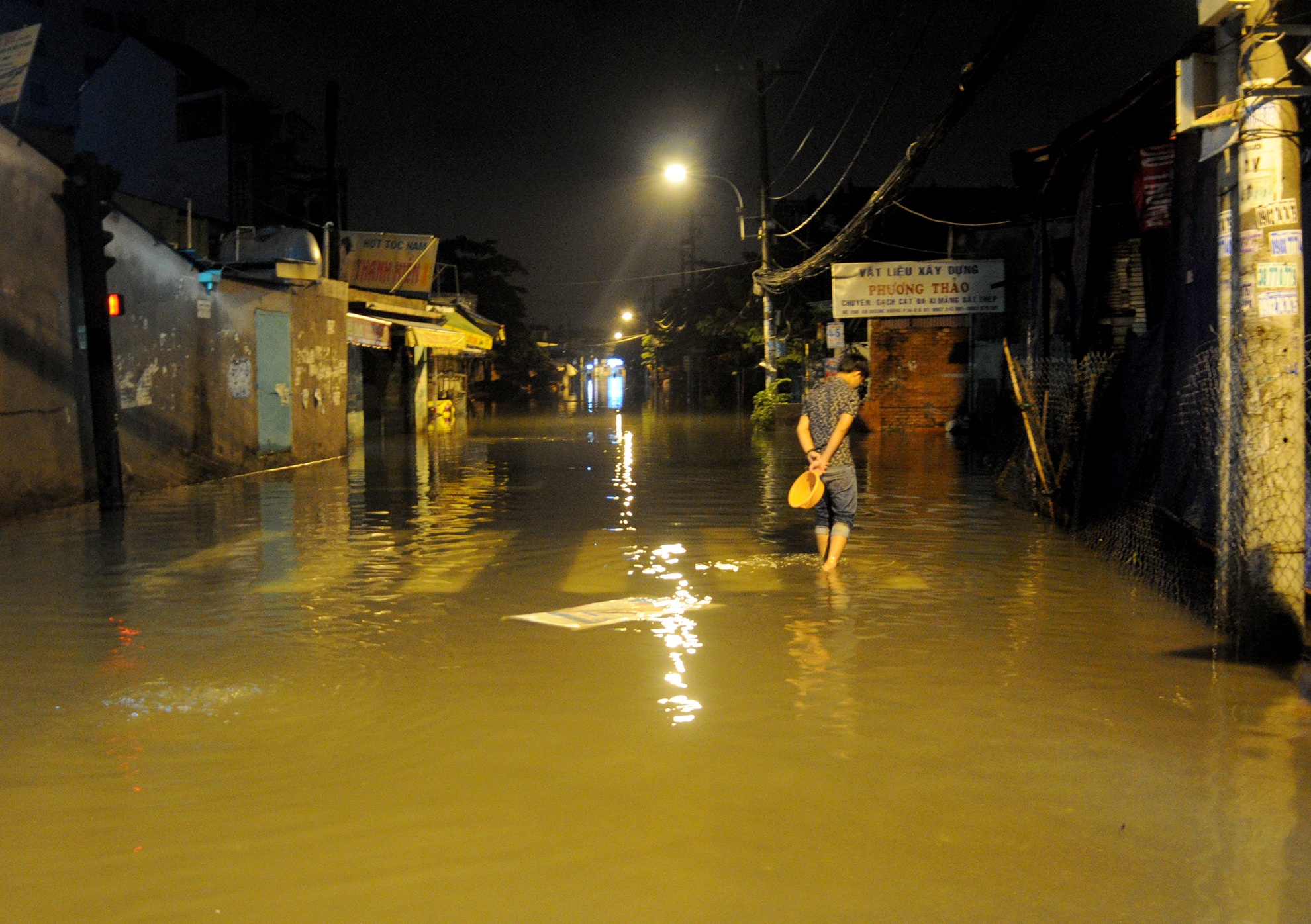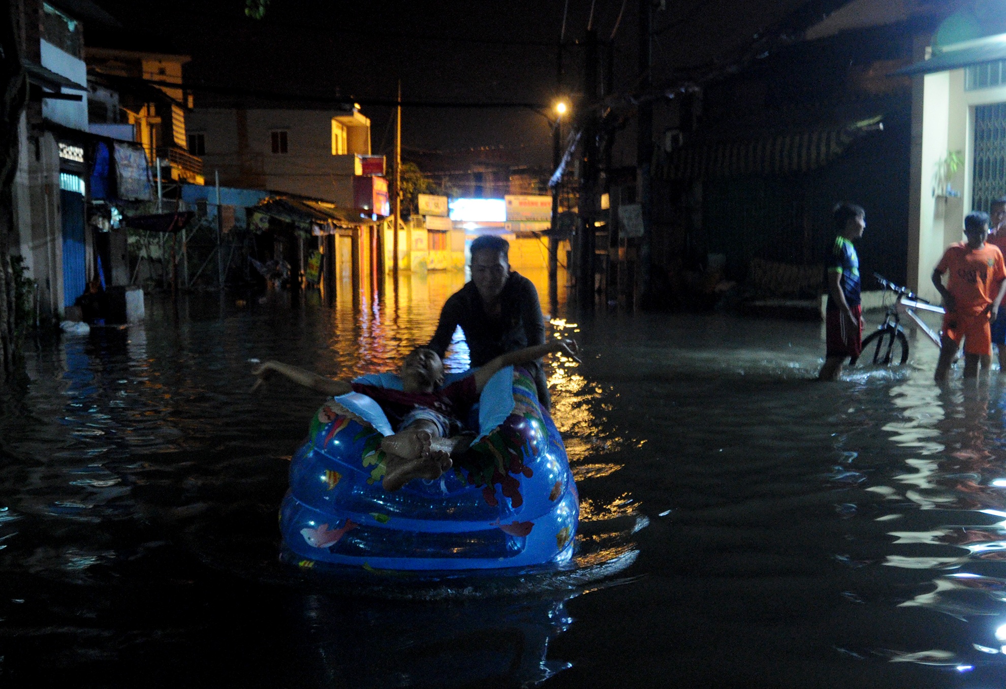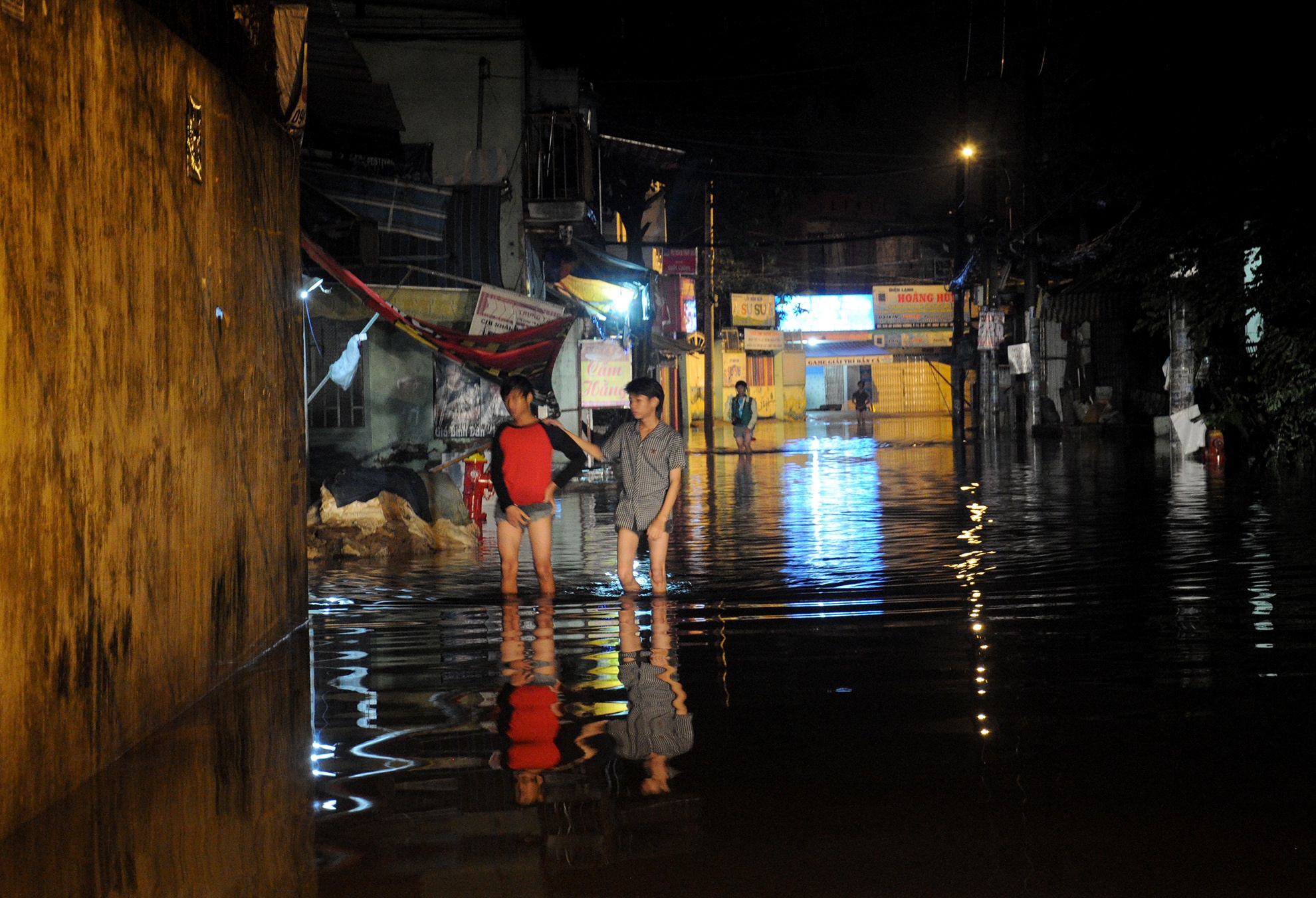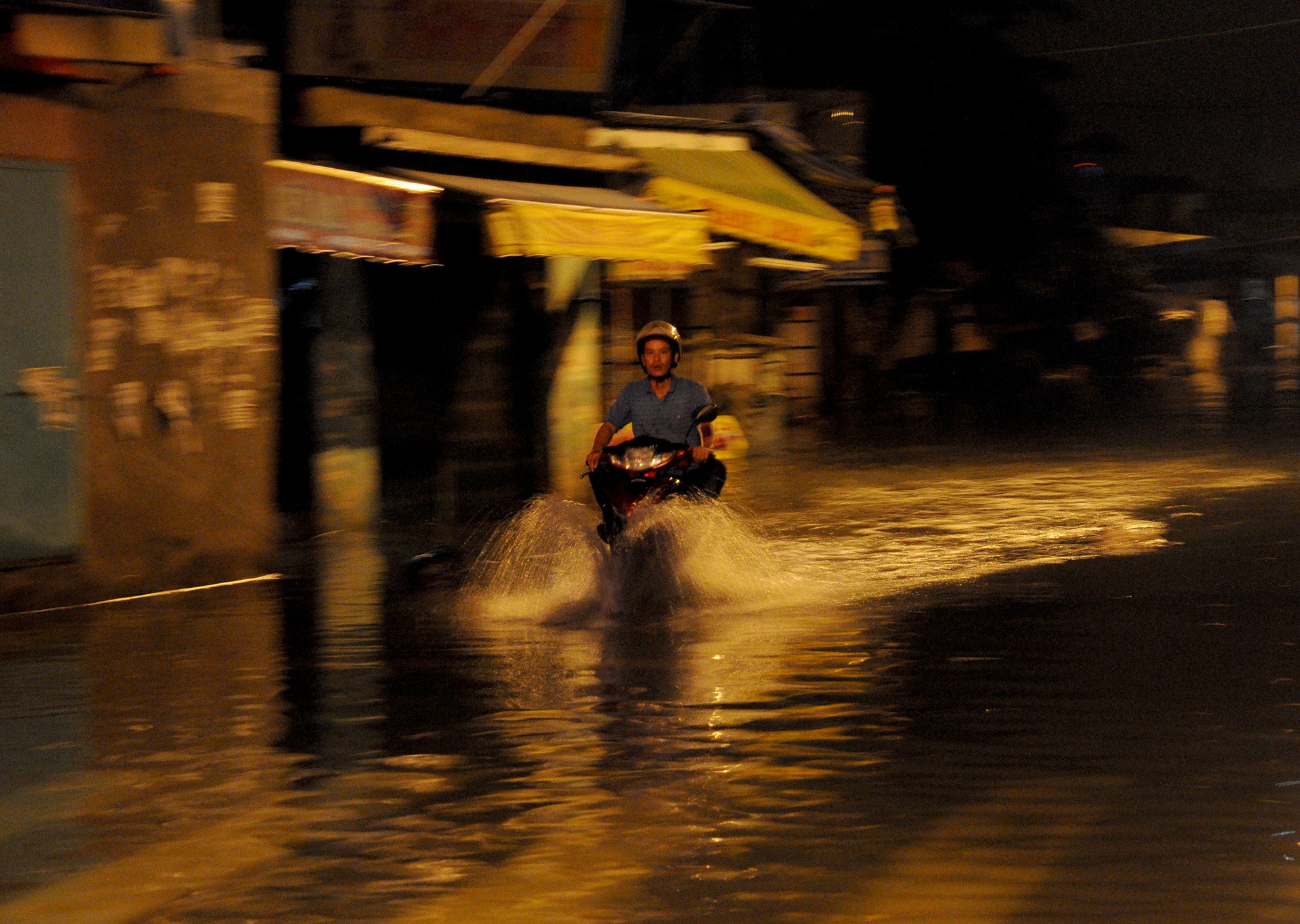 | Giữa đêm khuya, nhiều người bì bõm lội, phóng xe máy vượt qua đường ngập về nhà. Xung quanh nhiều tiếng đạp nổ, tiếng rú ga inh ỏi để sửa xe máy. Hàng nghìn hộ dân căng mình chống chọi với nước vào nhà xuyên đêm. |