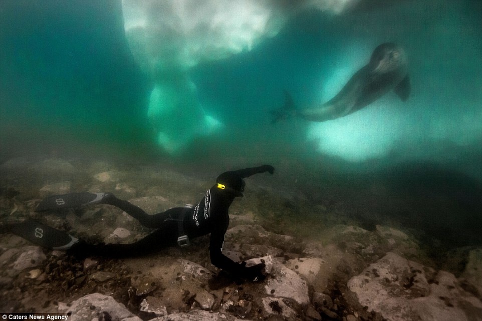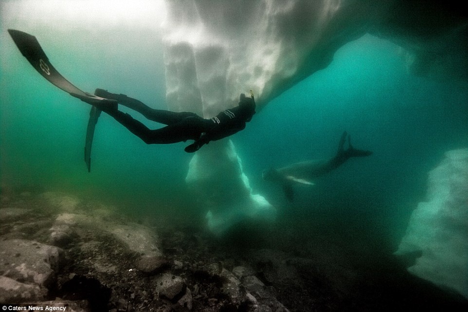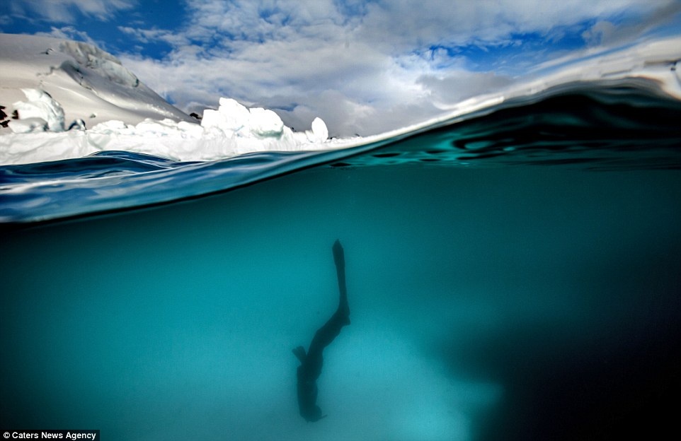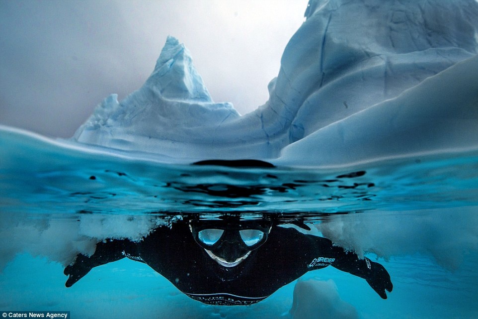 Alexandre Voyer (Pháp), 37 tuổi, đã xuống bơi trong làn nước lạnh giá của Nam Cực để tiếp cận hải cẩu và cá voi. |