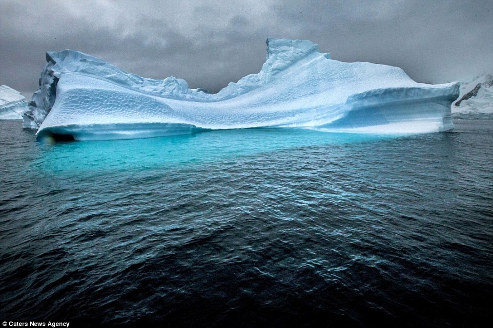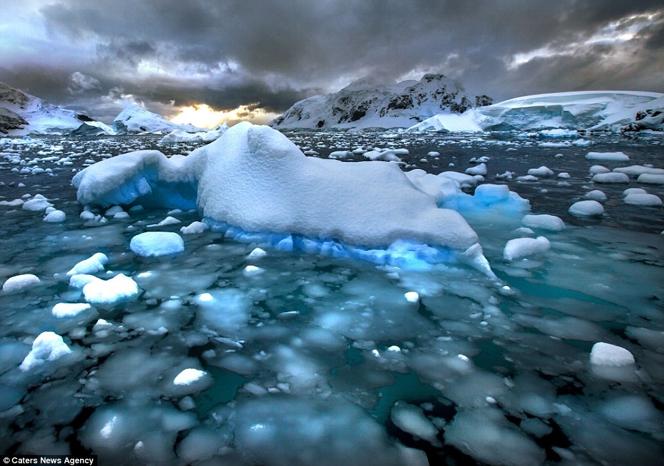 Làn nước băng giá của Nam Cực có những khung cảnh tuyệt đẹp, với băng trôi và băng hà rải rác trên mặt biển xanh thẳm. |