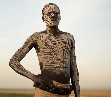 | Một người đàn ông Karo với nhiều nét vẽ trên cơ thể. |