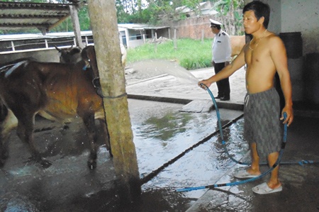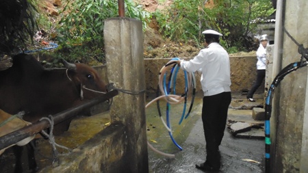 | Khi lực lượng chức năng kiểm tra, người làm công của chủ bò rút ống ngay lập tức, giống như đang tắm cho bò (trên tay vẫn còn cầm đoạn ống- Ảnh do chi cục cung cấp). |