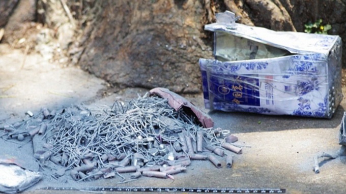 | Những vật thể bằng kim loại bên trong quả bom thứ nhất. Ảnh: Weibo. |