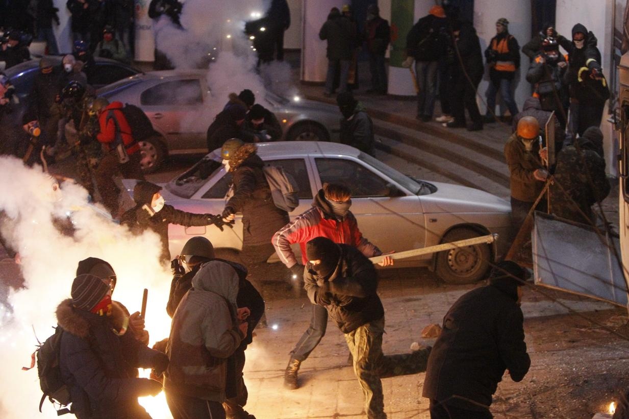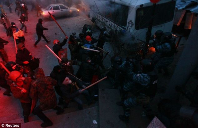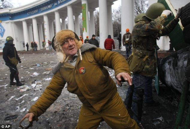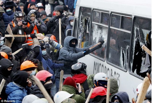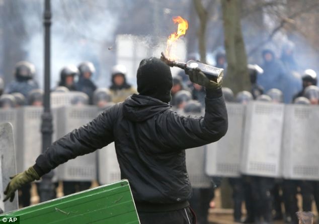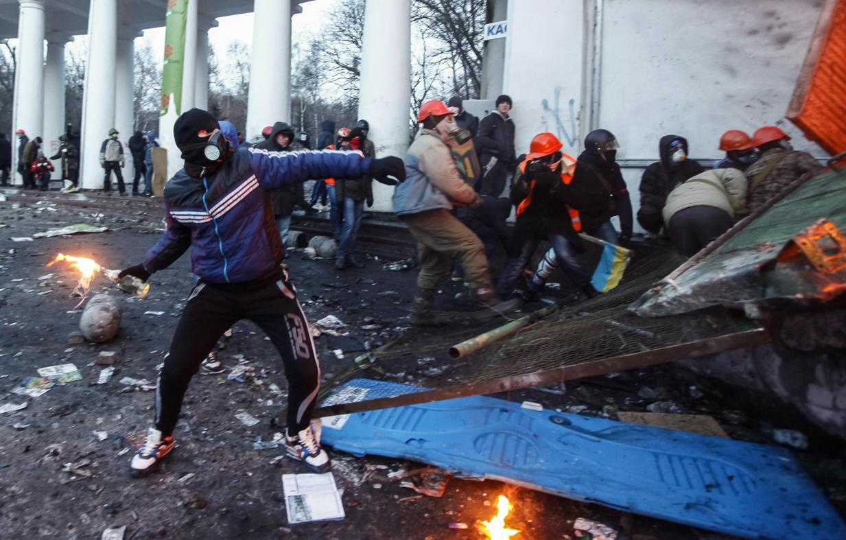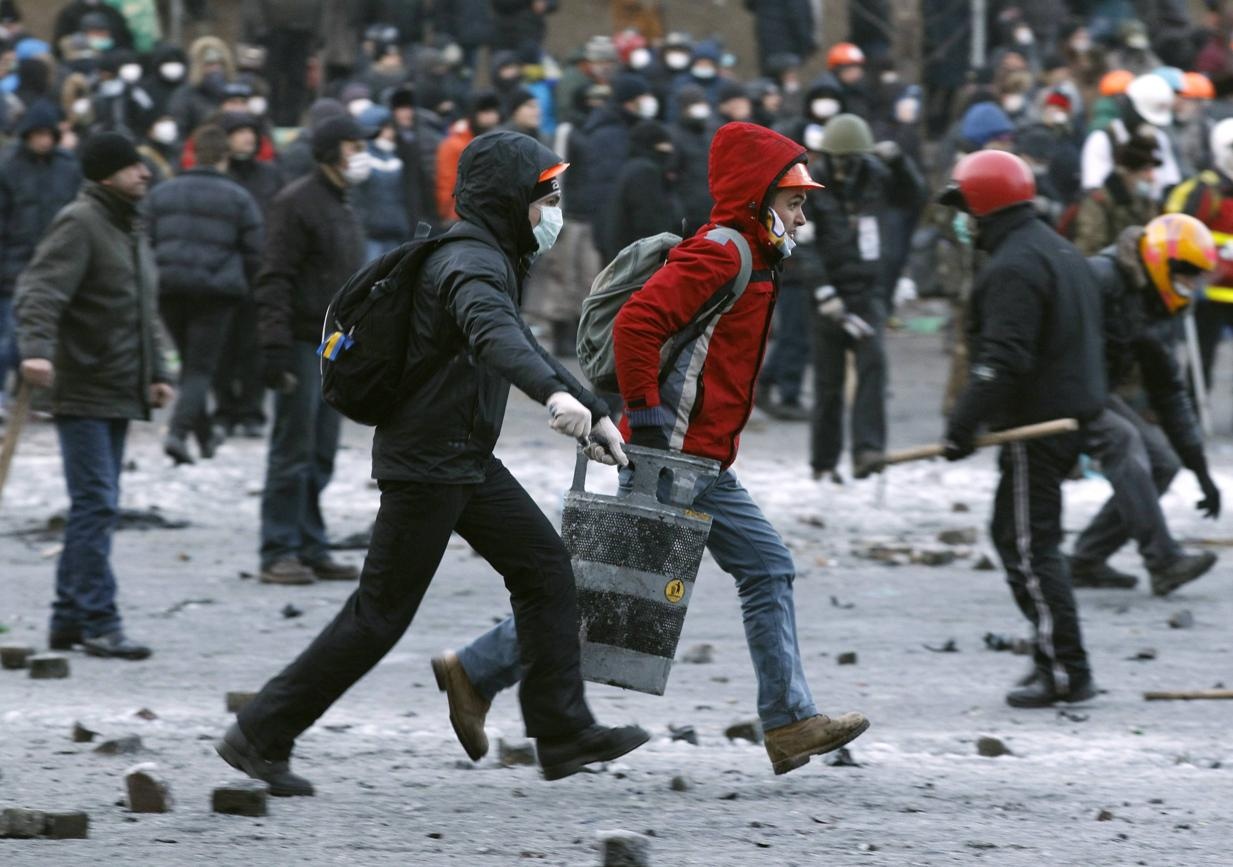Người biểu tình Ukraina dùng bom xăng, đá, súng cao su, thùng rác và nhiều thứ khác để chống trả cảnh sát trong cuộc tuần hành tại thủ đô Kiev hôm 20/1.