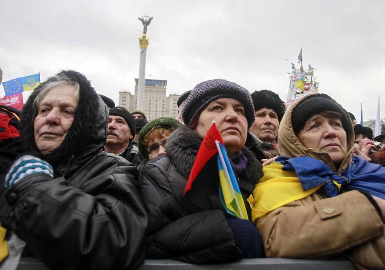 Bất chấp việc quốc hội Ukraina thông qua luật chống biểu tình vào tuần trước, vài chục nghìn người tiếp tục tuần hành trên các đường phố ở thành phố Kiev hôm 20/1 để phản đối việc chính phủ không ký một thỏa thuận về thương mại và hợp tác với Liên minh châu Âu. Ảnh: AP