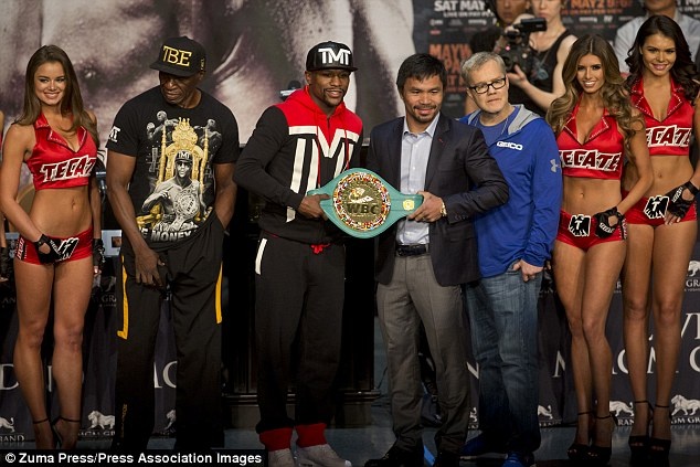 | Bốn người mẫu xuất hiện ở buổi họp báo trước trận quyền anh trị giá 300 triệu USD giữa Mayweather và Pacquiao ở Las Vegas. |