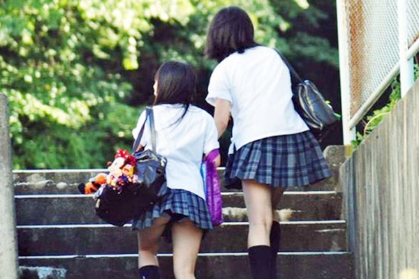 Những nữ sinh Nhật diện đồng phục không thể ngắn hơn thản nhiên đi lại trên đường phố.