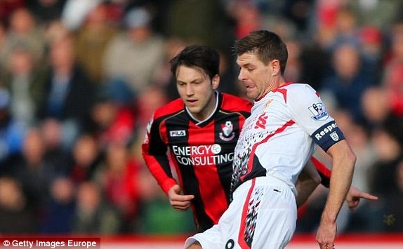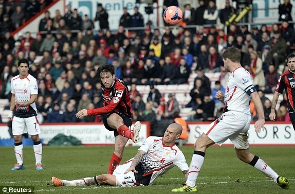 - Phút 25, Liverpool được hưởng quả đá phạt, nhưng Gerrard lại dứt điểm đưa bóng đi vọt xà ngang khung thành Bournemouth.