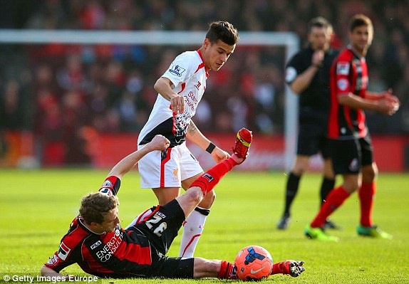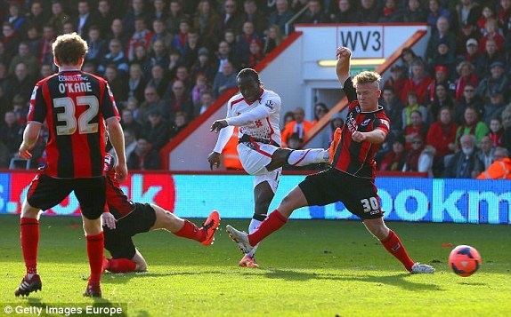Hậu vệ Skrtel nỗ lực cản phá cú sút của cầu thủ Bournemouth.