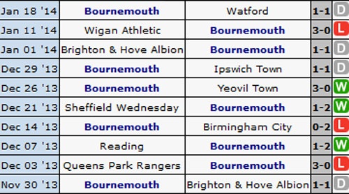 Thành tích thi đấu 10 trận gần đây của Bournemouth.