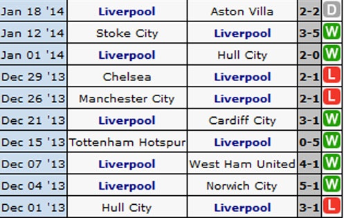 - Thành tích thi đấu 10 trận gần đây của Liverpool.