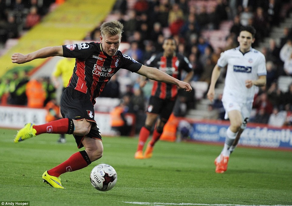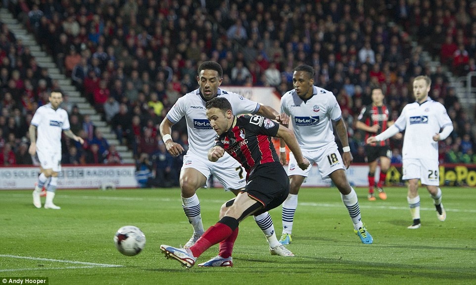| Sau 8 phút được chơi hơn người, Bournemouth có bàn thắng thứ ba trong trận gặp Bolton. |