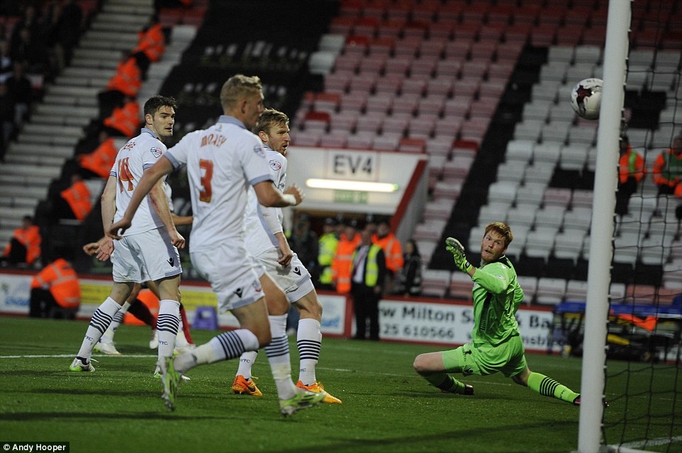 | Thủ môn Adam Bogdan của Bolton nỗ lực cản phá cú dứt điểm của Marc Pugh nhưng không thành công. |