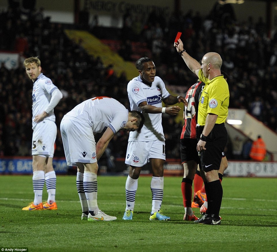 | Dorian Dervite của Bolton bị truất quyền thi đấu ở phút 70. |