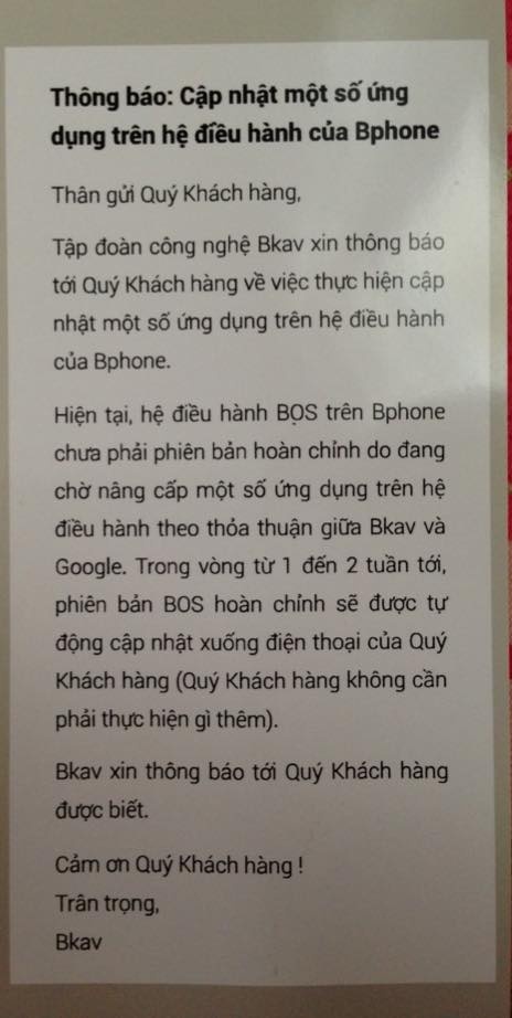 | Thông báo BKAV gửi đến những khách hàng nhận được Bphone. Ảnh: Nguyễn Đăng Bền. |