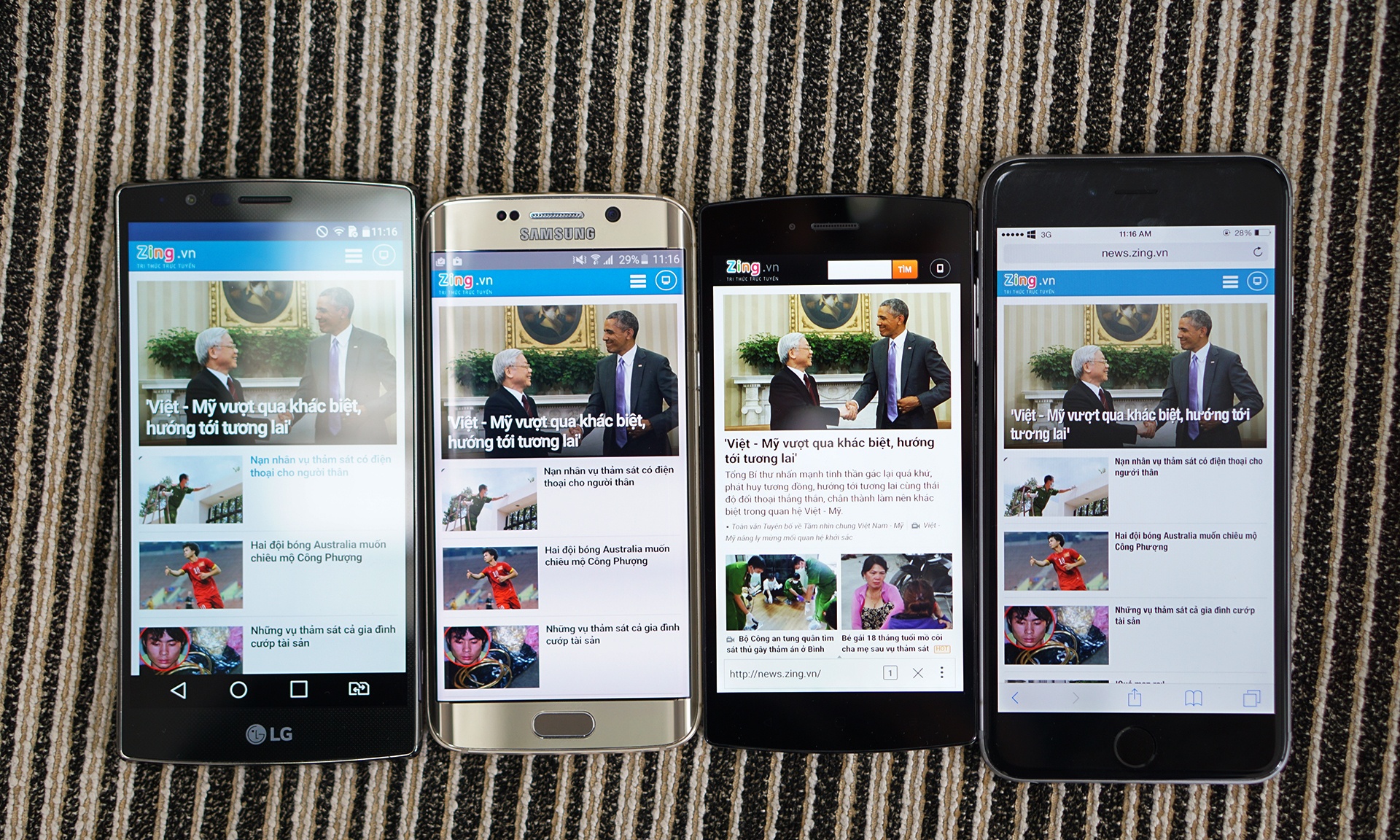 | Cả bốn model đều có cách bố trí các phím điều hướng khác nhau. LG G4 mang bốn phím cơ bản của mình vào trong màn hình, Samsung và Apple vẫn dùng nút home vật lý và Bphone đưa cả ba phím ra bên ngoài nhưng chỉ sáng lên khi được chạm vào. |