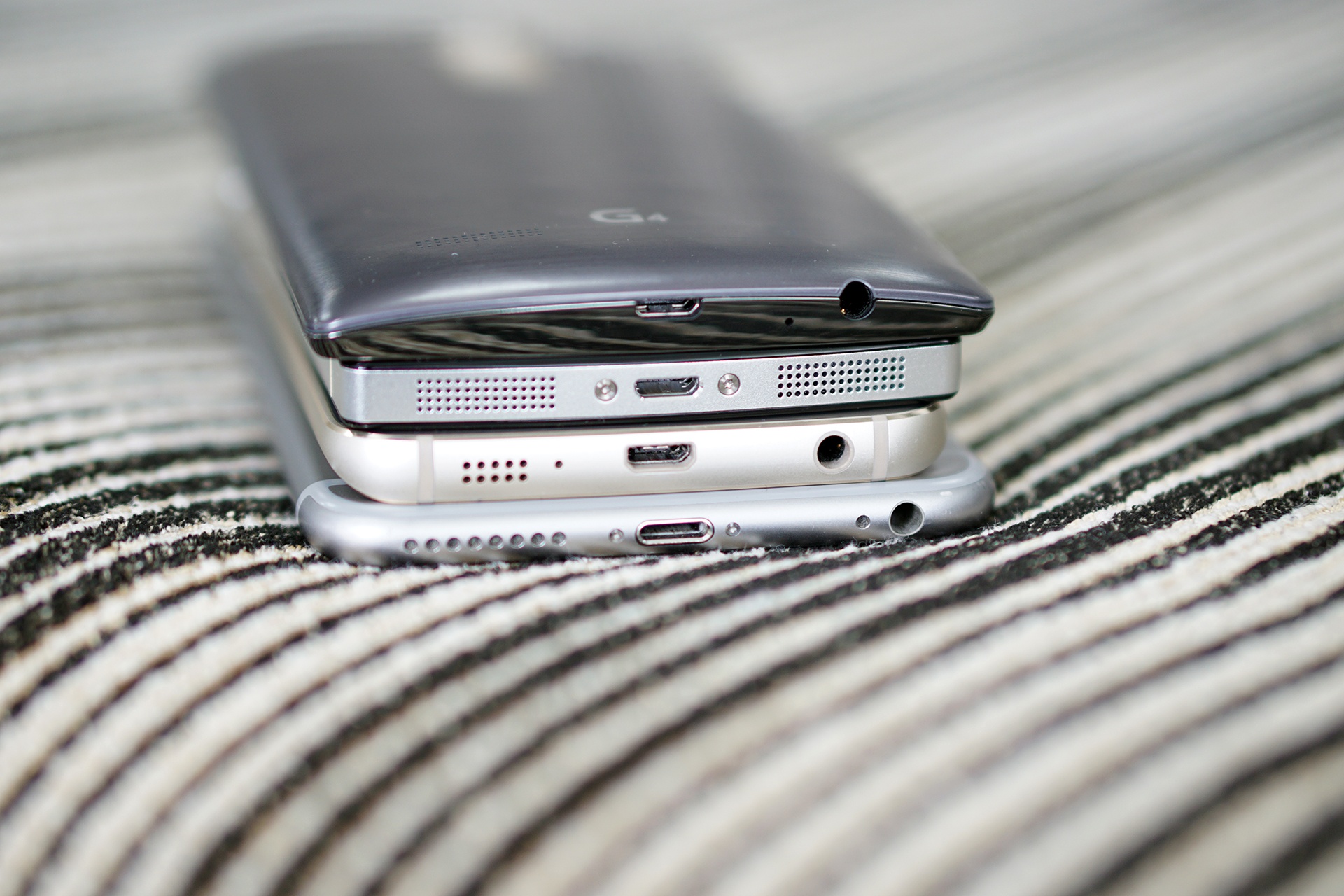 | Xét thiết kế cạnh dưới, chỉ có LG G4 khác biệt với ba mẫu còn lại. Bphone, Galaxy S6 Edge và iPhone 6 Plus đều có những dải loa, micro, ốc đối xứng, giắc âm thanh khá giống nhau. |