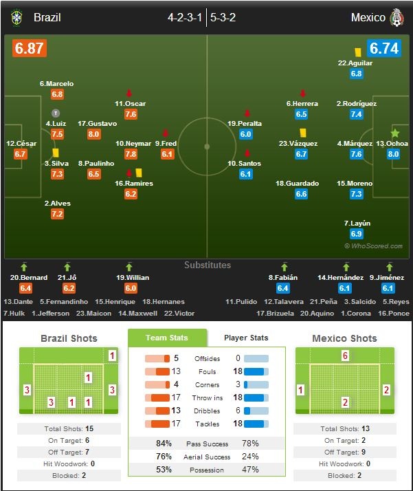 Thi đấu khá bế tắc trong 45 phút đầu buộc HLV Scolari phải có sự điều chỉnh khi hiệp 2 trở lại. Bernard vào sân thay thế cho một Ramires có thừa sức mạnh nhưng thiếu khả năng gây đột biến. Và sự thay đổi của Big Phil đã cho thấy tác dụng. Bernard chính là người đã có đường chuyền tuyệt vời để Neymar khống chế khéo léo bằng ngực trước khi tung ra cú dứt điểm ở phút 71. Tuy nhiên một lần nữa, người chiến thắng lại là Ochoa.