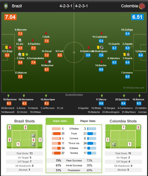 Dù không thể đoạt vé đi tiếp, nhưng đoàn quân do HLV Jose Pekerman dẫn dắt chơi khá hay. Việc lọt vào tứ kết là thành tích tốt ngoài mong đợi của người hâm mộ Colombia. Còn với đội chủ nhà Brazil, các vũ công samba sẽ gặp tuyển Đức ở bán kết World Cup 2014 trên con đường chinh phục cúp vàng lần thứ 6.