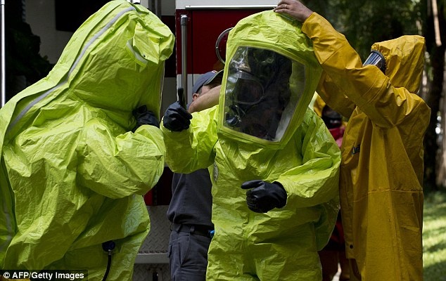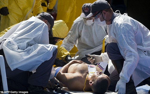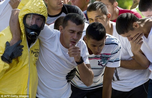 Nhân viên an ninh tiến hành khử nhiễm cho nạn nhân. Những chất độc trên bộ phận cơ thể bị nhiễm khuẩn sẽ được làm sạch dưới một vòi nước lưu động cỡ lớn.