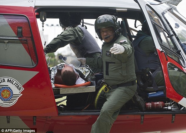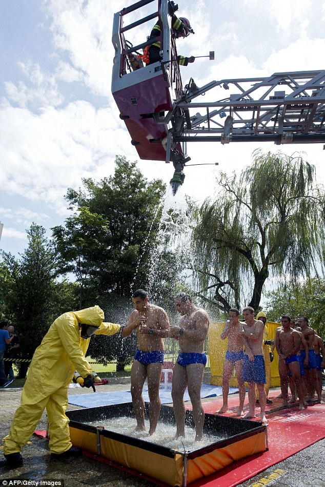 Mới đây, Brazil vừa tổ chức một cuộc diễn tập lớn để phòng chống bạo động, biểu tình và khủng bố tại các thành phố đăng cai tổ chức. Trong ảnh, nhân viên an ninh đang giúp "nạn nhân" đối phó với cuộc tấn công bằng vũ khí hóa học.
