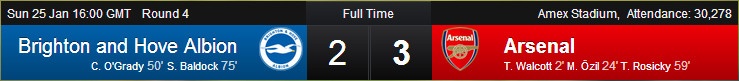 Sau những cú sẩy chân bất ngờ của một loạt “ông lớn” Premier League tại vòng 4 cúp FA, Arsenal hành quân tới Brighton với sự tập trung cao độ. Điều đó giúp đội khách nhập cuộc tốt và sớm có được bàn thắng vượt lên dẫn trước ở phút thứ 2 của Theo Walcott. Đây cũng là pha lập công đầu tiên của tuyển thủ Anh cho các Pháo thủ sau 398 ngày.