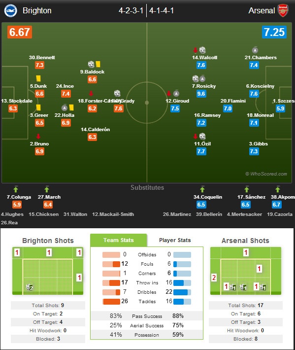 Trong khoảng 15 phút cuối trận, Brighton vùng lên mạnh mẽ và tạo ra không ít tình huống sóng gió về phía khung thành đối diện. Nếu may mắn hơn, đội bóng của HLV Chris Hughton đã được hưởng một quả phạt đền ở phút 86 sau tình huống để bóng chạm tay rõ ràng của Chambers trong vòng cấm. Dẫu vậy, chiến thắng dành cho Arsenal vẫn hoàn toàn xứng đáng bởi thế trận vượt trội và tần suất các tình huống nguy hiểm mà đội khách tạo ra rõ ràng nhỉnh hơn hẳn so với đội chủ nhà.