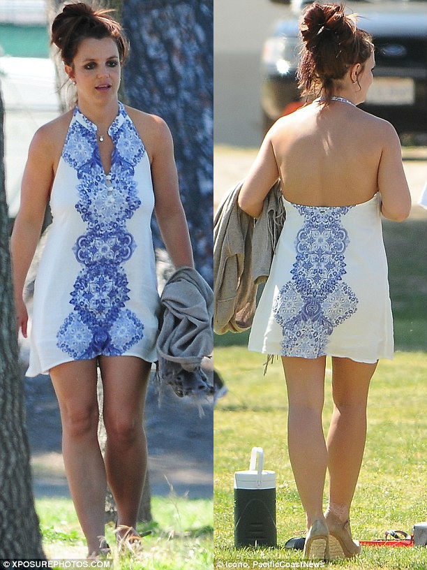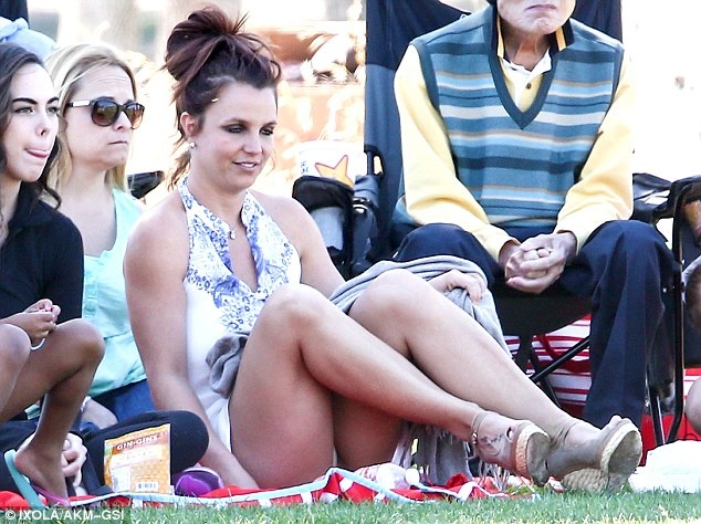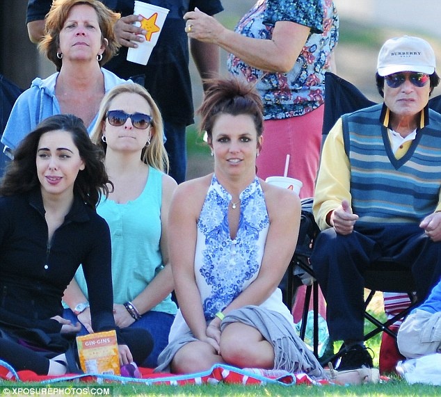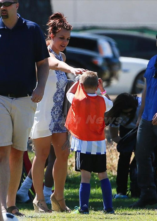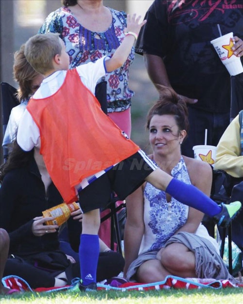 | Sau khi che chắn cẩn thận, Britney thoải mái ngồi xem và cổ vũ cho hai cậu con trai đang chơi bóng trên sân. |
