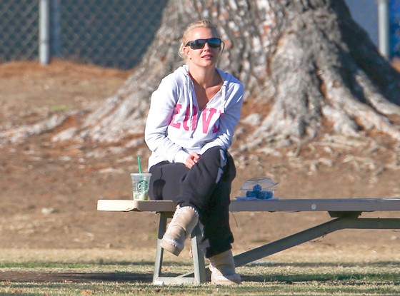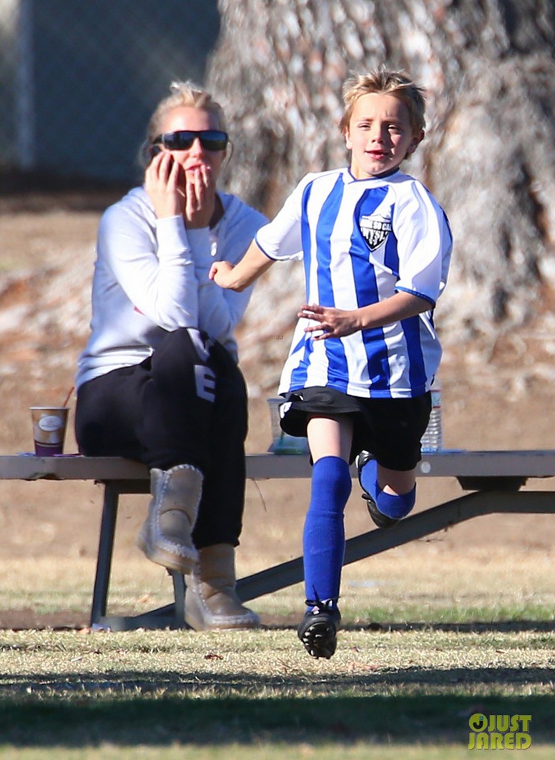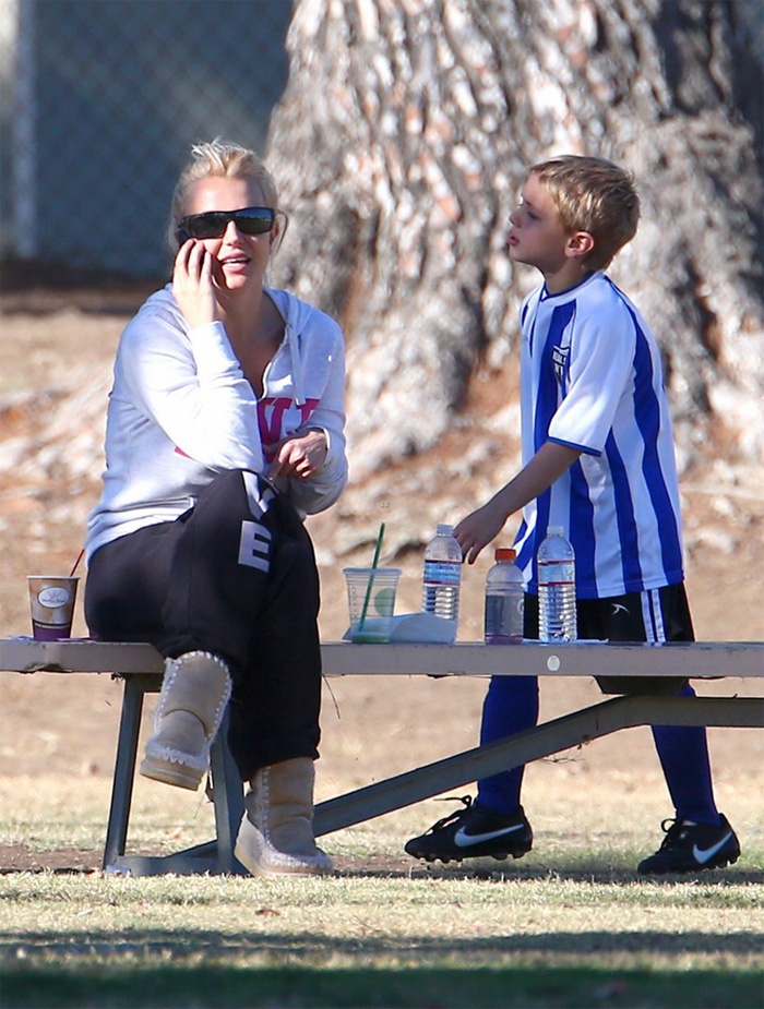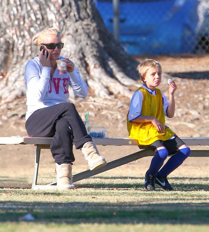 | Ngày hôm qua (2/11) tại công viên Canoga ở California, Britney Spears tới xem trận bóng đá có 2 cậu con trai Sean – 8 tuổi và Jayden – 7 tuổi thi đấu. Nữ ca sĩ tóc vàng ăn mặc kín trong bộ đồ thể thao in hình chữ Love, cô đi với vệ sĩ nhưng chỉ riêng Britney ngồi xem các con chơi. |
