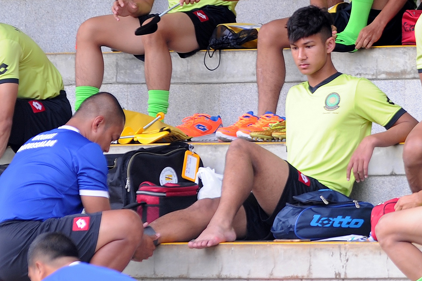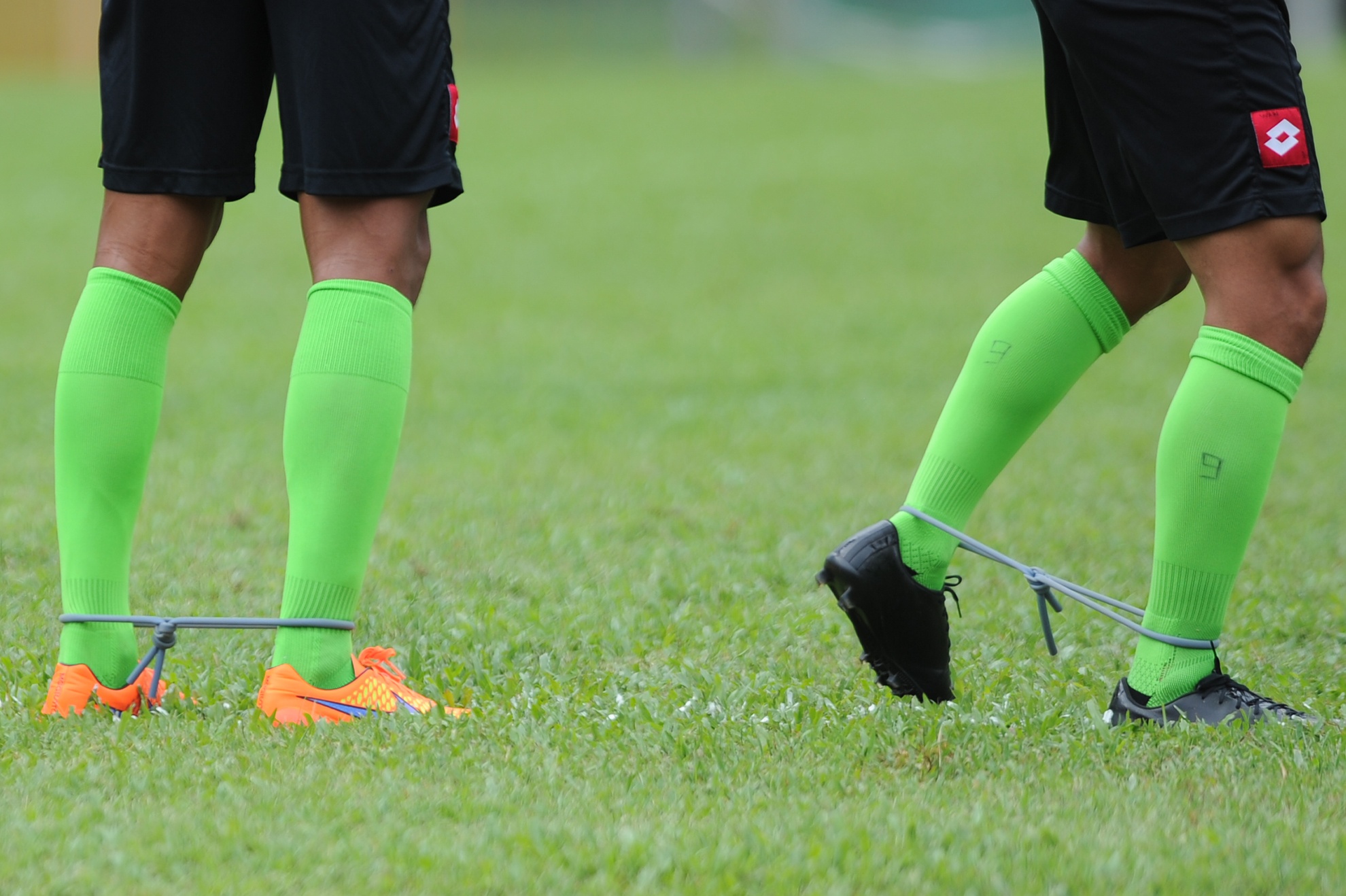 | Sau khi khởi động nhẹ, HLV trưởng Stephen Ng Heng Seng đã giao cho các cầu thủ trẻ một bài tập với dây vòng quấn quanh hai cổ chân. |