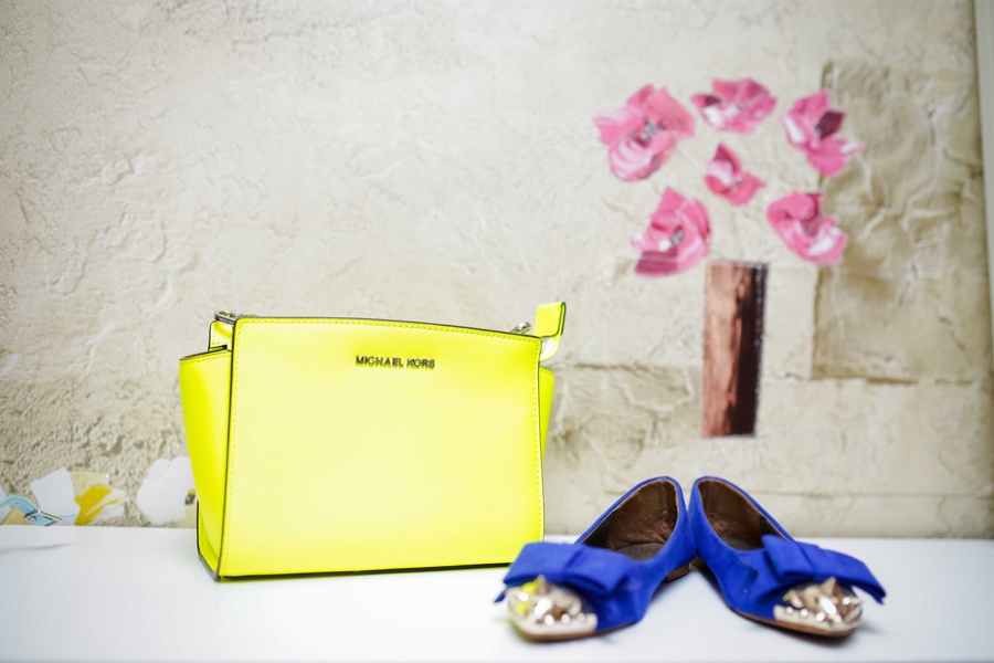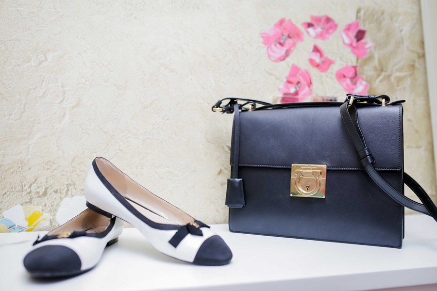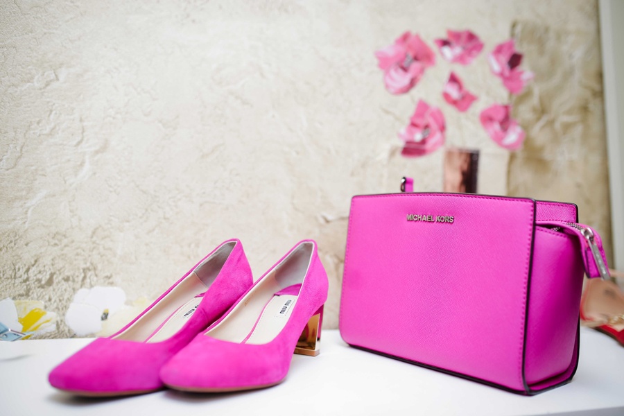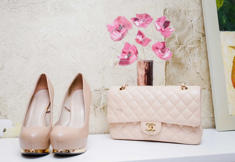 | Túi xách và giày tông màu nude được đặt cạnh nhau tinh tế và sang trọng. |