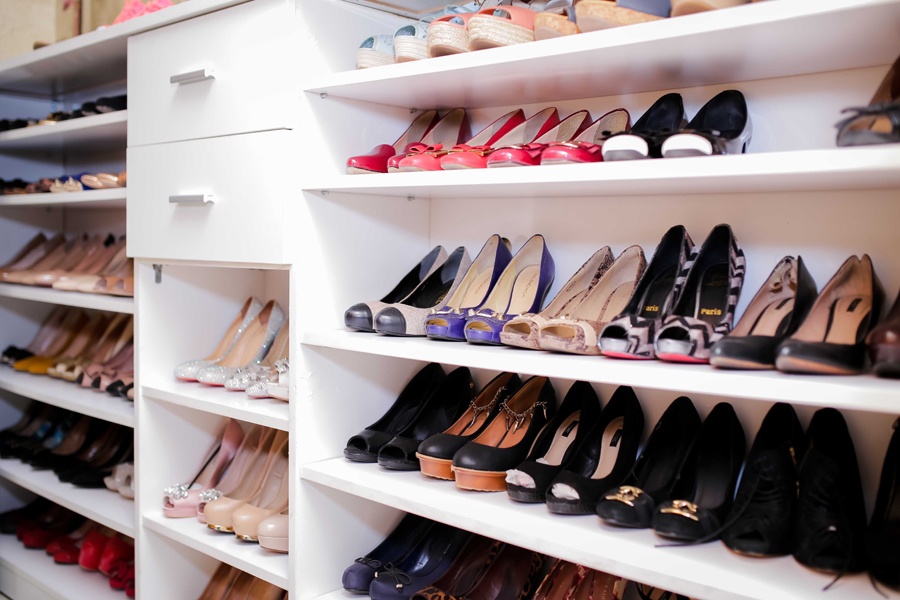 Căn phòng khá ngăn nắp với các kệ tủ gỗ được sắp xếp gọn gàng. Những đôi giày yêu thích của nữ chủ nhân được sắp đặt theo thứ tự hợp lý về gam màu, kiểu dáng. Những đôi giày dành cho tiệc tùng được ưu ái ở ngăn tủ có gam trắng, giày đế bệt được đặt trên cao để tiện việc sử dụng hàng ngày.