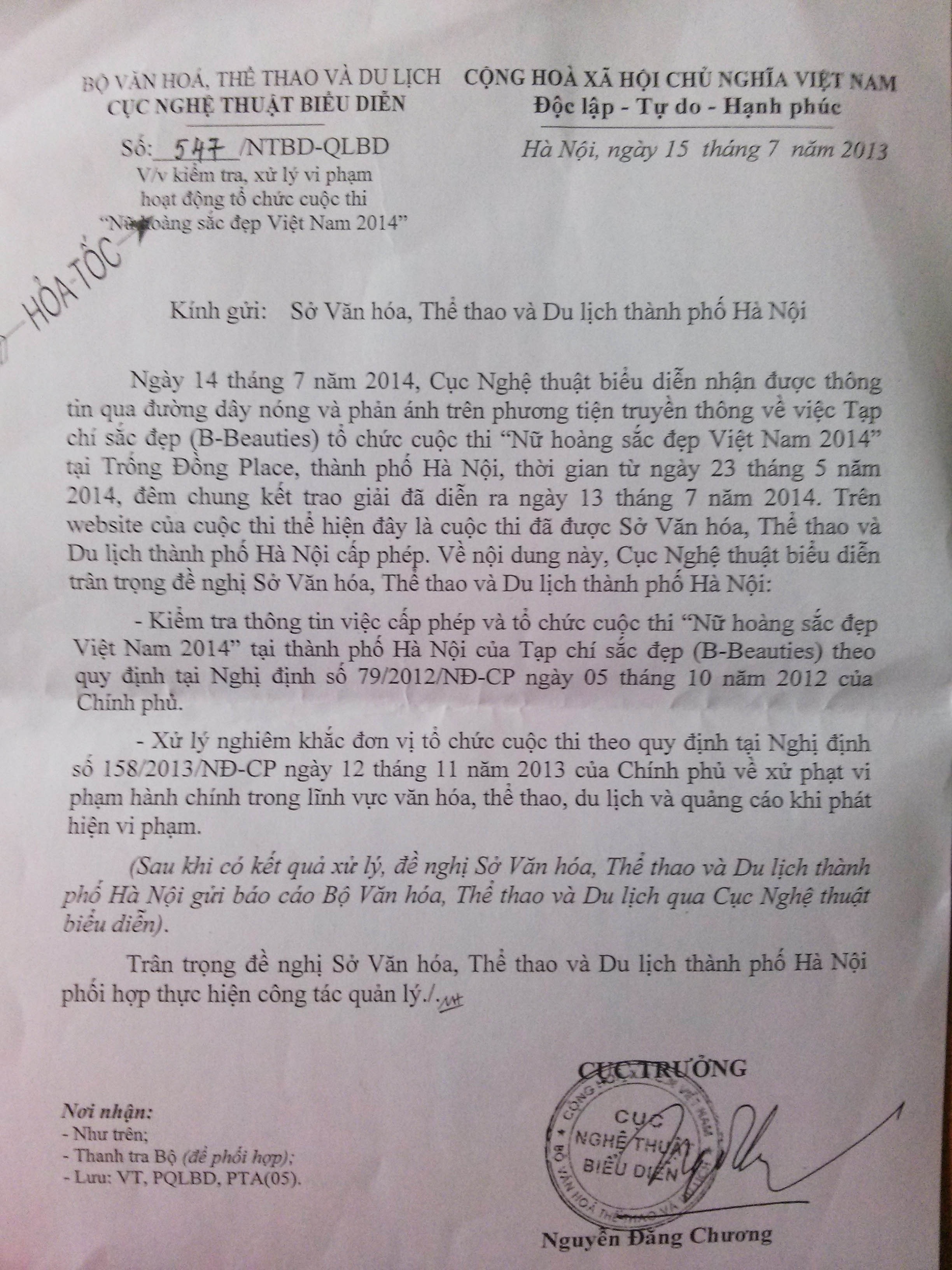Chiều 15/7, Cục Nghệ thuật Biểu diễn gửi công văn hỏa tốc tới Sở Văn hóa, Thể thao và Du lịch Hà Nội để kiểm tra, xử lý vi phạm hoạt động tổ chức cuộc thi Nữ hoàng sắc đẹp Việt Nam 2014. Trong đó ghi rõ: "Ngày 14/7, Cục Nghệ thuật Biểu diễn nhận được thông tin qua đường dây nóng và phản ánh trên phương tiện truyền thông về việc tạp chí sắc đẹp (B-Beauties) tổ chức cuộc thi Nữ hoàng sắc đẹp Việt Nam 2014 tại Hà Nội, thời gian từ ngày 23/5. Đêm chung kết trao giải đã diễn ra ngày 13/7. Trên website của cuộc thi thể hiện đây là cuộc thi đã được Sở Văn hóa, Thể thao và Du lịch Hà Nội cấp phép".