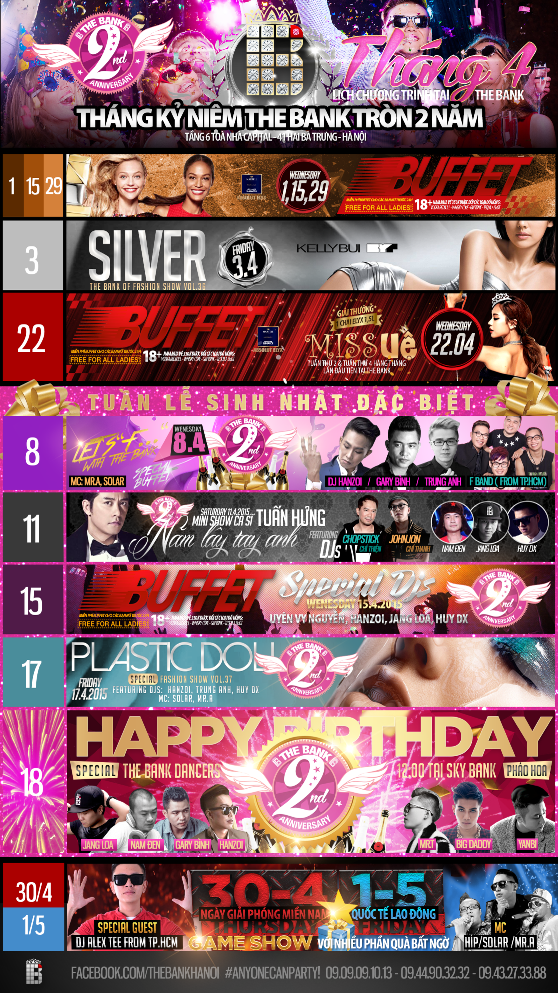 Sự kiện chính The Bank 2nd anniversary diễn ra vào ngày 18/4, đánh dấu ngày The Bank Entertainment chính thức tròn 2 năm hoạt động và bước sang năm thứ 3 với màn pháo hoa rực rỡ lúc nửa đêm. Những vũ công đặc biệt khuấy động không khí ngày sinh nhật bằng màn trình diễn thú vị và ấn tượng. Cùng với đó là sự xuất hiện của 3 rapper Big Daddy, Yanbi, Mr.T và dàn DJ hàng đầu Việt Nam như Nam Đen, JangLoa, Hanzoi, HuyDX, Gary Bình, UyênVy Nguyễn, Trung Anh và MC Mr.A, Solar. Tất cả hứa hẹn sẽ làm nên một bữa tiệc sinh nhật nhiều cảm xúc, đa sắc màu và sôi động.