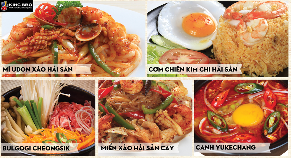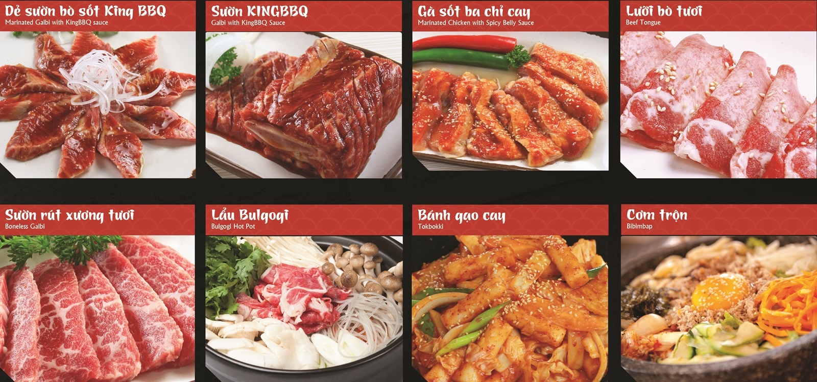 Thực đơn King BBQ đa dạng với các loại nguyên vật liệu tươi ngon, kết hợp cùng các loại sốt tẩm ướp đặc trưng góp phần tạo nên điểm đặc trưng, thu hút thực khách của nhà hàng. Thực khách sẽ không thể bỏ qua những món nướng của nhà hàng như dẻ sườn bò Mỹ, sườn bò Mỹ sốt King, sườn bò Mỹ không xương thượng hạng…