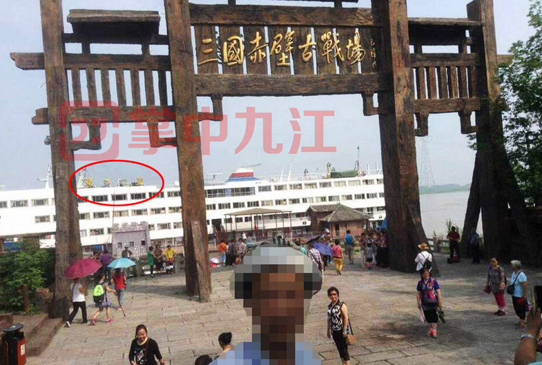 Hình ảnh tàu Ngôi sao phương Đông tại bến "Chiến trường cổ Xích Bích, Tam Quốc". Trong khi Quan Quang 6 cập bến Kinh Châu an toàn vào ngày 2/6, Ngôi sao phương Đông không thể tới điểm dừng chân vì gặp thời tiết xâu khi di chuyển trên sông Dương Tử đêm 1/6.