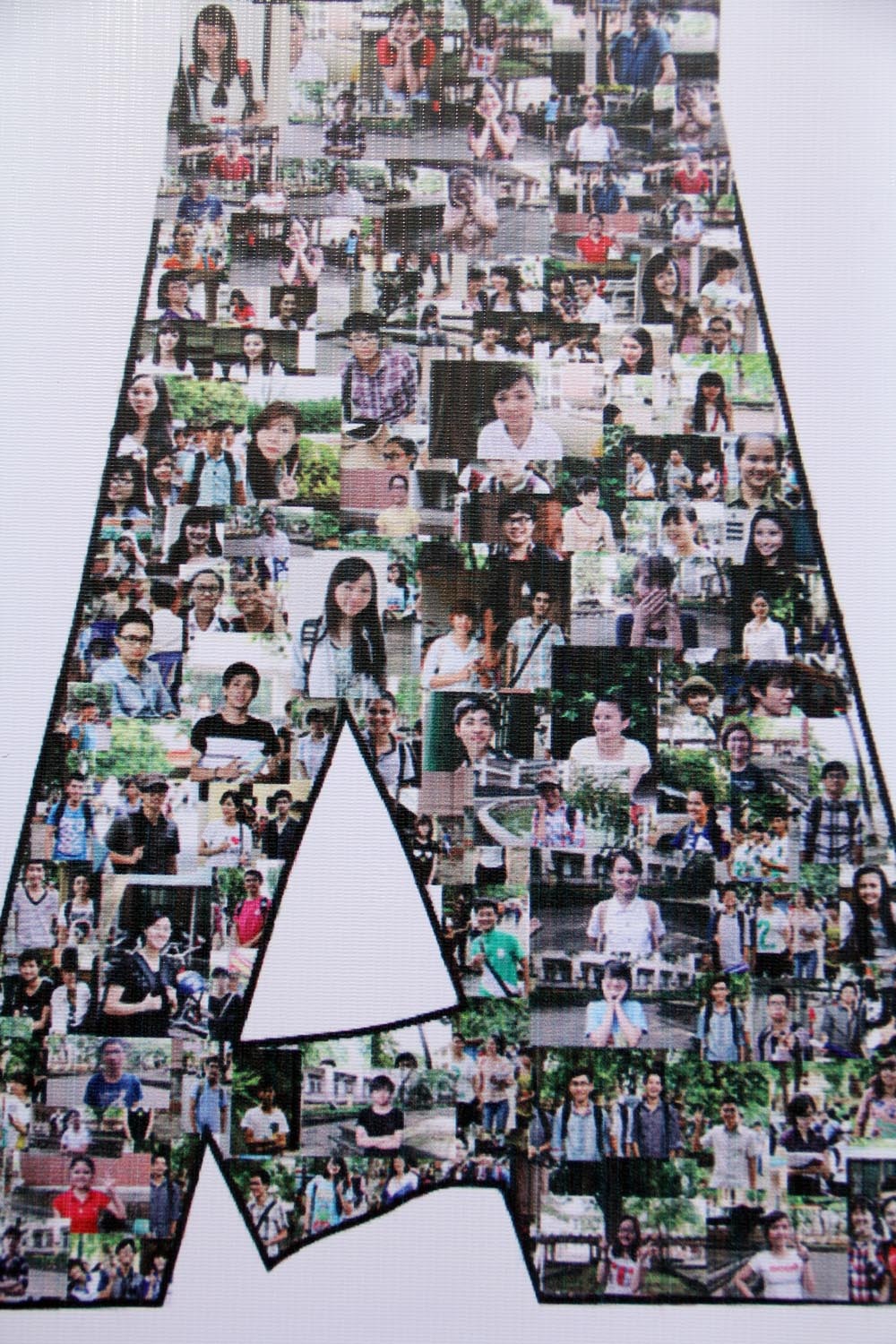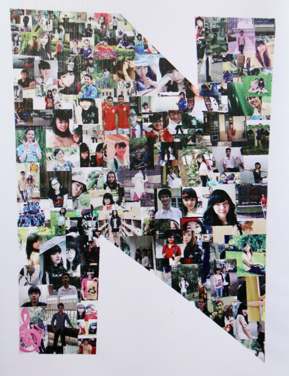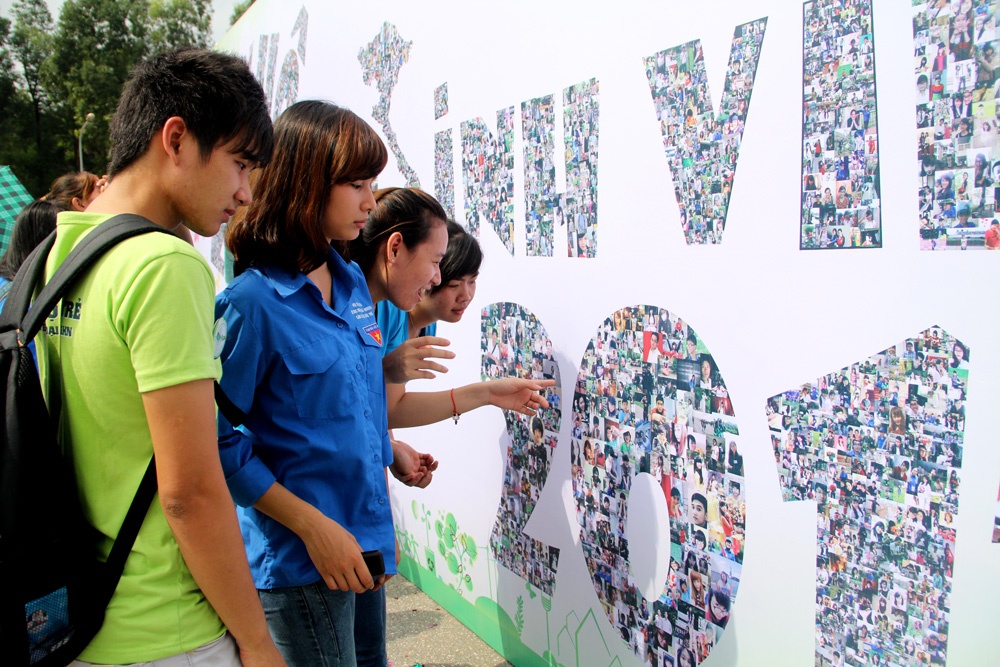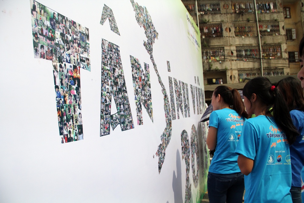 | Bức ảnh này có diện tích khoảng 25m2 được ghép từ 12.000 bức hình chân dung tạo thành dòng chữ "Ngày hội tân sinh viên 2013". Đây là điểm độc đáo của chương trình năm nay. |