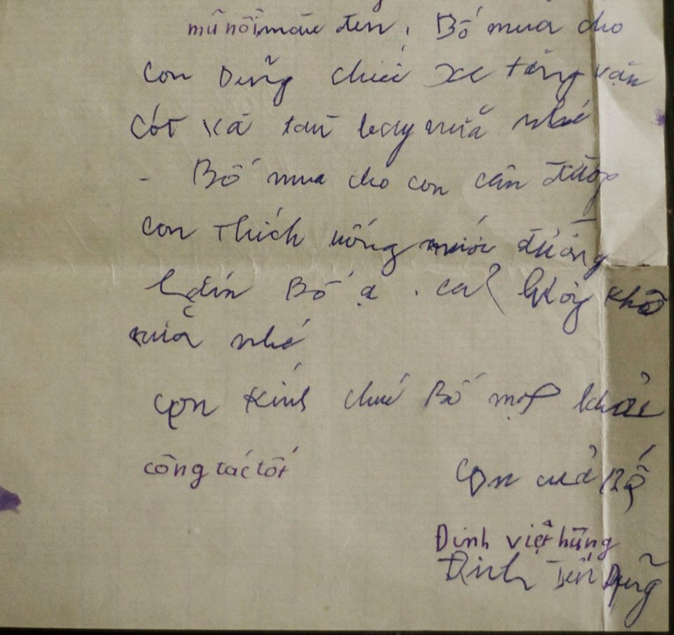 "Đây là trích đoạn bức thư hai anh em mình viết gửi bố năm 1985, khi bố đang đóng quân trong TP.HCM. Mình lúc đó mới hơn 4 tuổi, đương nhiên là chưa biết viết. Nhưng muốn tự tay viết thư, nên phải nhờ ông anh cầm tay mình để "vẽ" chữ hộ. Nội dung thì là của mình rồi, nội dung như sau: